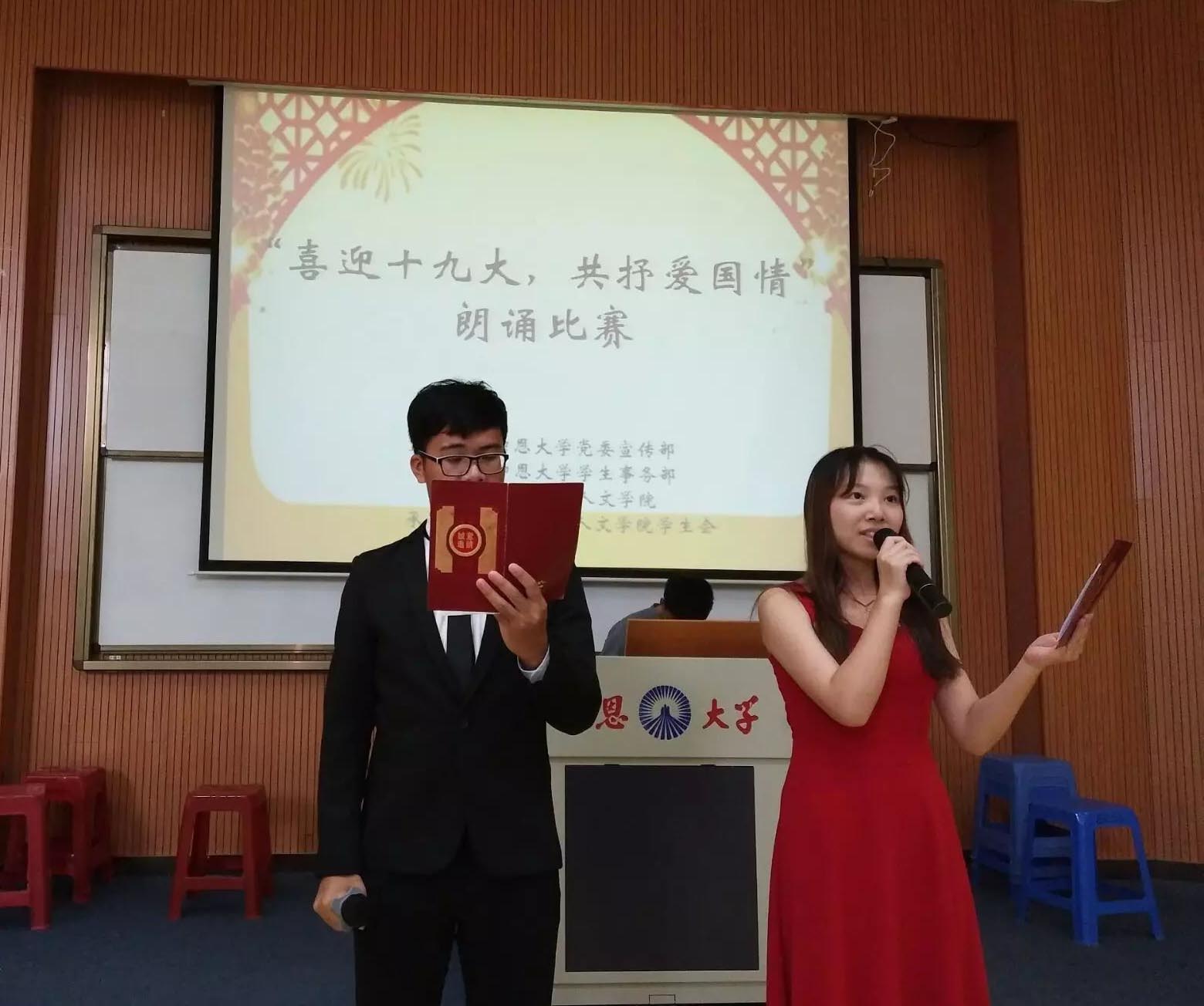 正值党的十九大召开之际,为营造十九大的喜庆氛围,抒发当代大学生的爱国情怀。开云kaiyun体育于10月18日下午在第三教学区和昌楼惟勤讲堂举办“喜迎十九大,共抒爱国情”朗读比赛初赛。开云kaiyun体育党总支书记胡友仁,辅导员李少聪、朱婷、刘巧玫,中文系教师李清霞、张彩英等出席了本次活动。