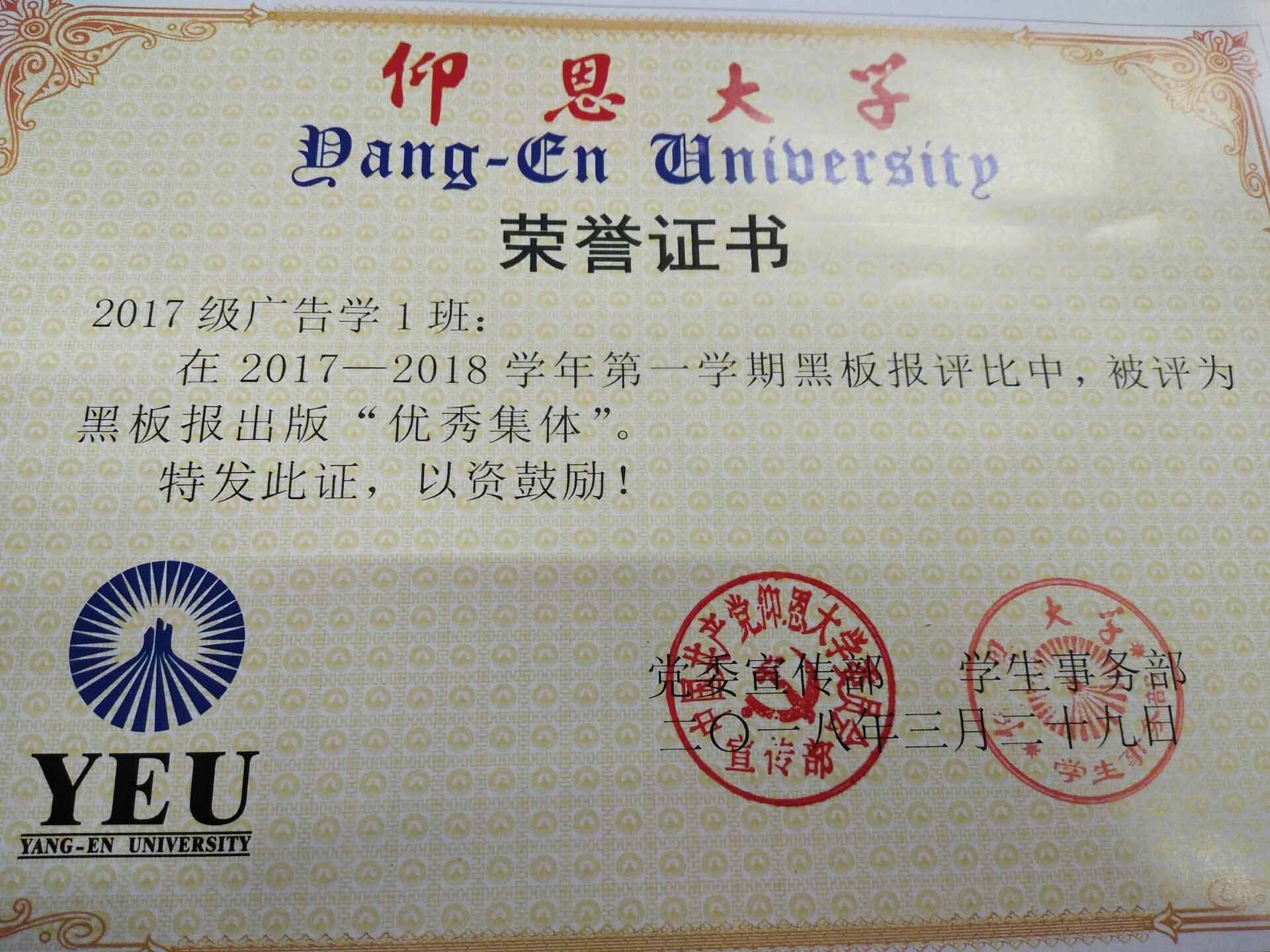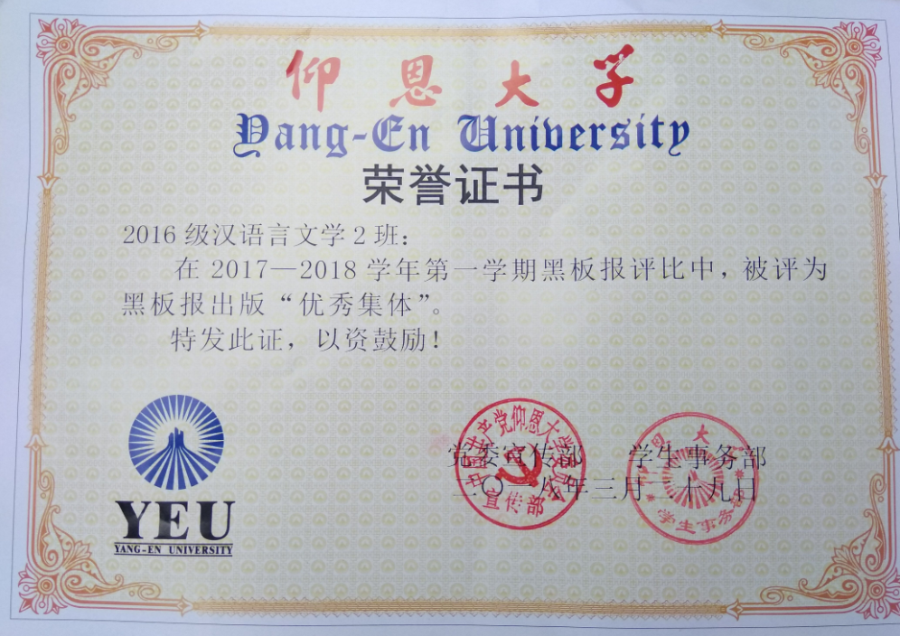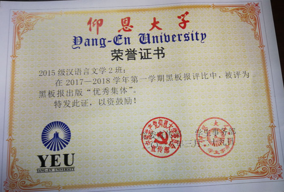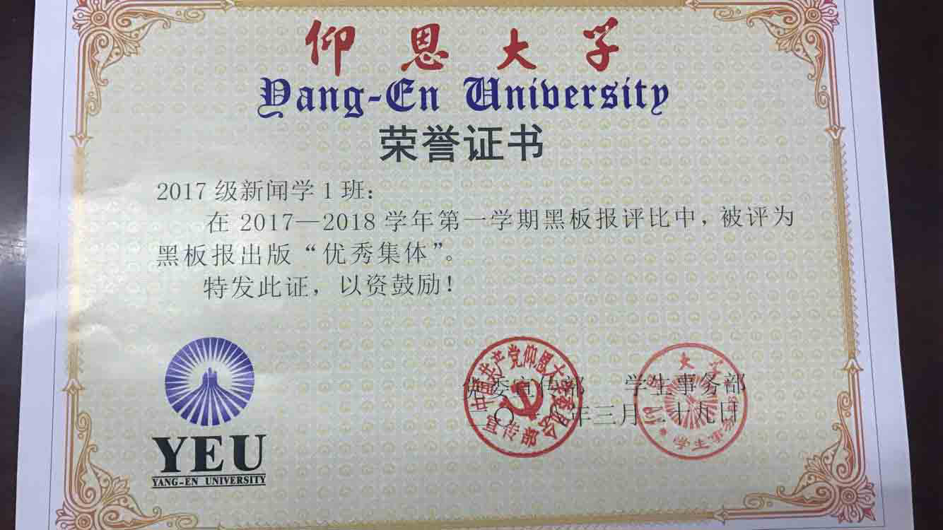 在2017—2018学年第一期黑板报评比中,开云kaiyun体育有5个班级被评为黑板报出版“优秀集体”,他们分别是15新闻学1班、15汉语言文学2班、16汉语言文学1班、16汉语言文学2班、17新闻学1班、17新闻学2班、17广告学1班。