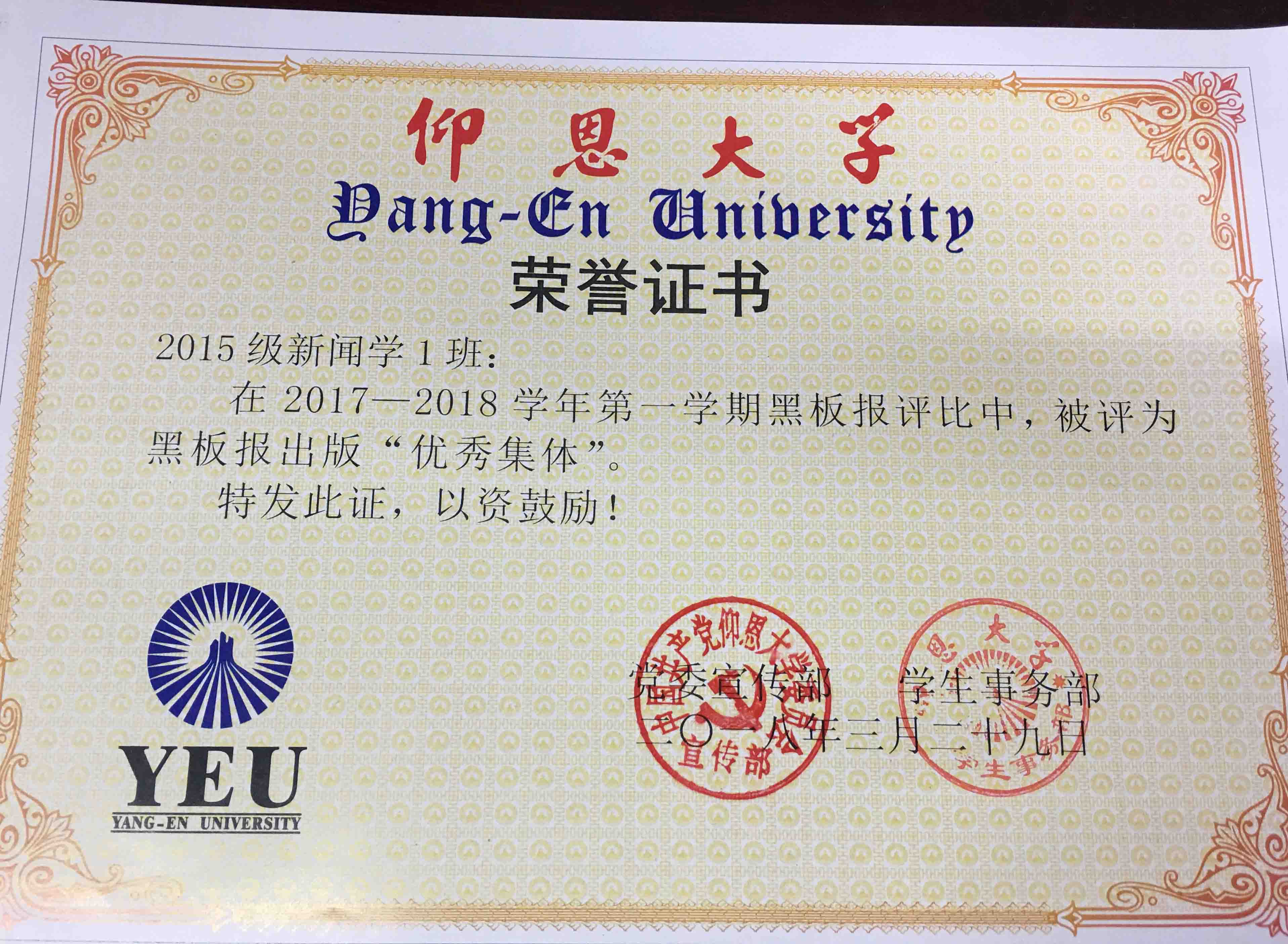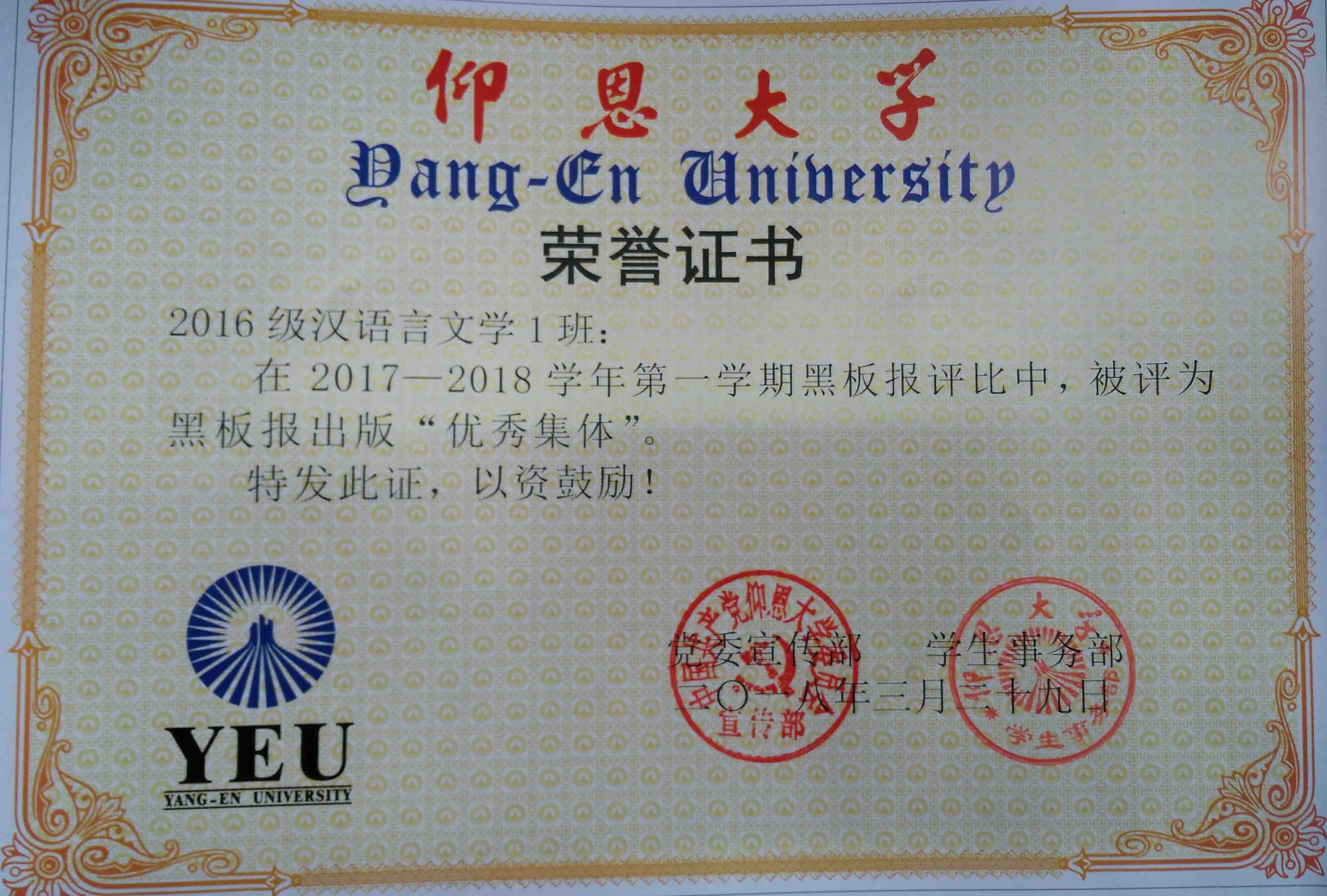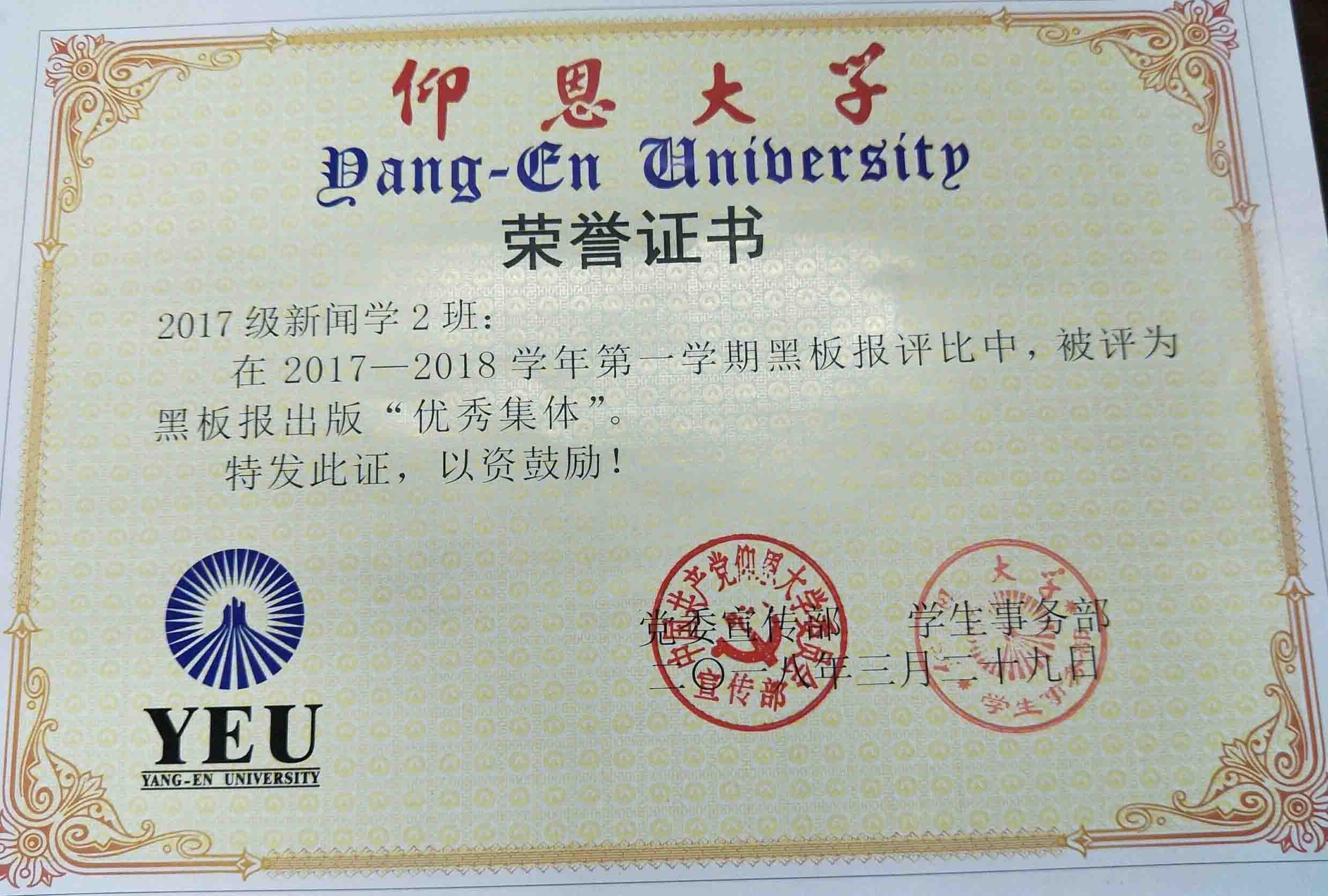 在2017—2018学年第一期黑板报评比中,开云kaiyun体育有5个班级被评为黑板报出版“优秀集体”,他们分别是15新闻学1班、15汉语言文学2班、16汉语言文学1班、16汉语言文学2班、17新闻学1班、17新闻学2班、17广告学1班。