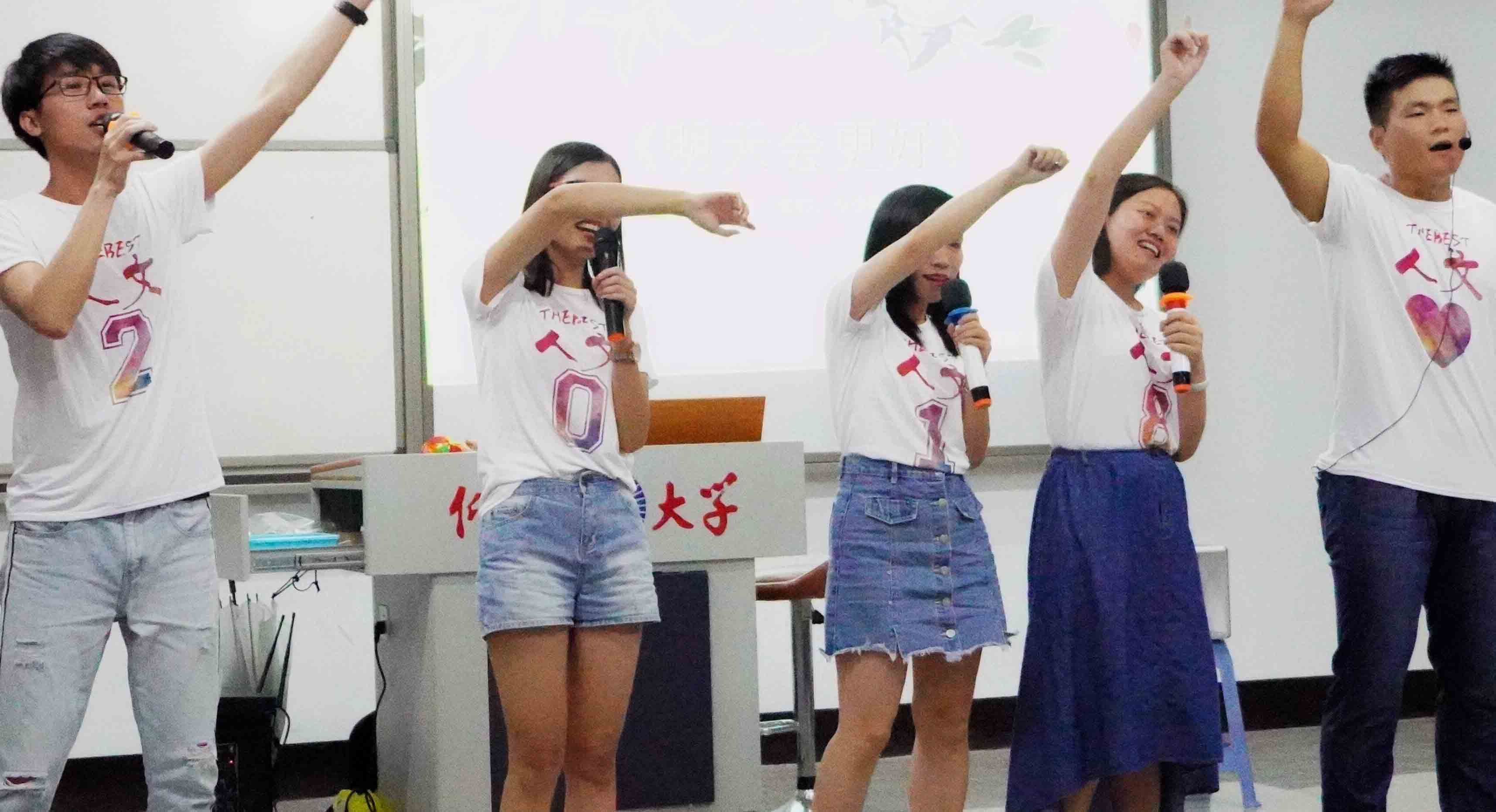 胡友仁老师发表讲话 晚会以学生会文艺部的成员带来的《江南+eiei》拉开序幕,他们以甜美的歌声和矫健的舞姿,赢得大家的喝彩。紧接着,凌乐健带来一曲《消愁》,用他独特的嗓音勾起了大家无限的回忆,使得双手不自觉的跟着节拍摇摆。让人意想不到的是刘巧玫、陈峰、朱婷、李少聪和林志荣老师,身着“人文2018”的服装走上台,为大家带来了一曲《明天会更好》以甜美的歌声充分展现了人文风采以及对未来的美好憧憬。现场闪光灯在同学们的手中纷纷亮起跟着摇摆,仿佛自己置身星海。最激动人心的游戏环节是“击鼓传花”,接到花球的同学们接受惩罚,纷纷上台表演才艺,李少聪老师以一首《小幸运》震惊全场。朱婷老师和曹流老师深情演唱了一首《后来》,赢得了热烈的掌声和呐喊声。“心有灵犀”这个游戏环节更是有趣,胡友仁等老师也参与其中,他们的语言和肢体表达赢得了场下阵阵笑声。在“给你真挚祝福”这个环节,大家纷纷在小卡片上为陌生人写下寄语,通过随机抽取的方式将自己的祝福传递出去。最后,此次晚会以一首全体成员深情演唱的《感恩的心》完美落幕。