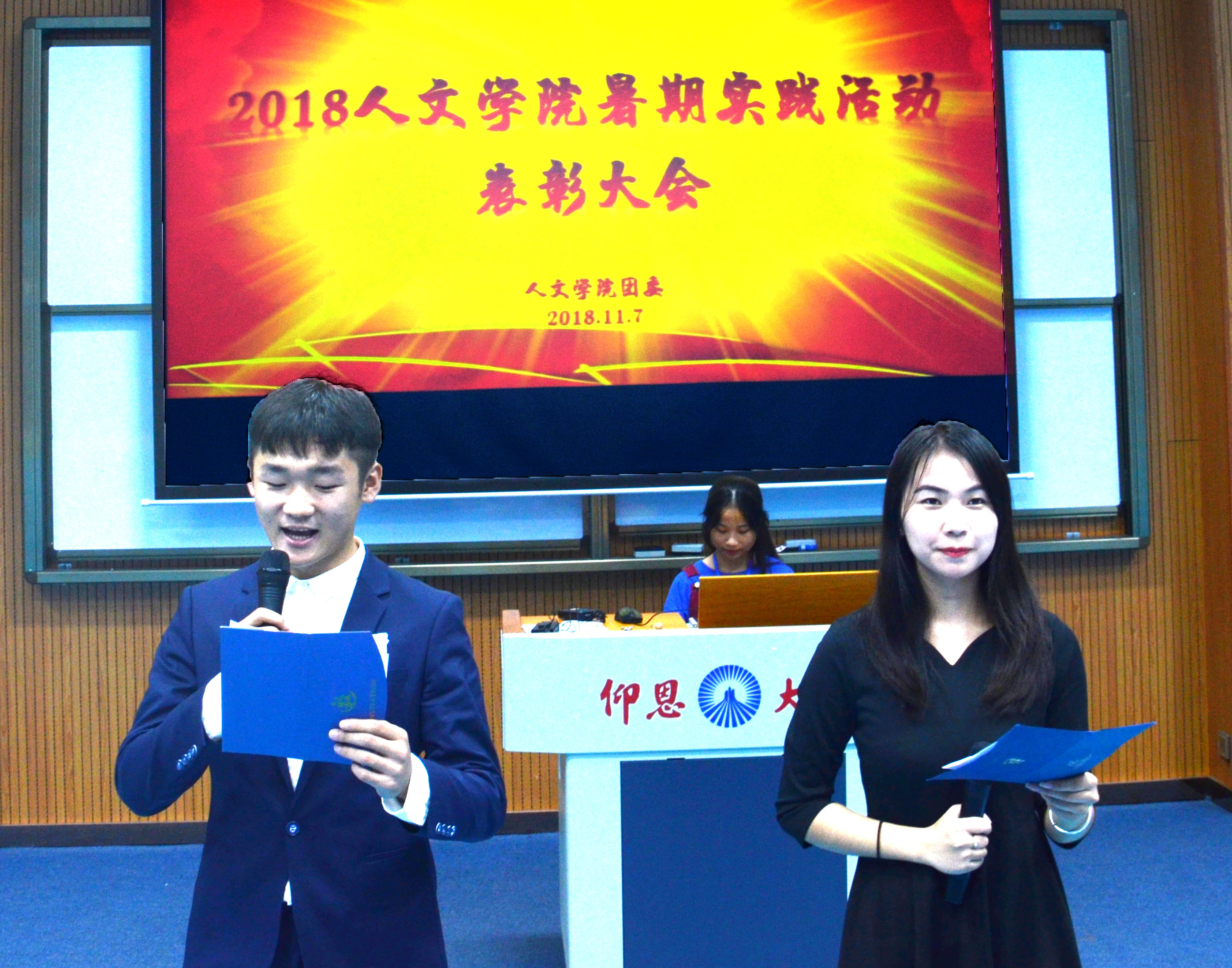 主持人开场 开云kaiyun体育于11月7日晚在和昌楼海纳讲堂举办了2018年开云kaiyun体育暑期实践活动表彰大会。开云kaiyun体育党总支书记兼副院长胡友仁、辅导员刘巧玫、朱婷、李少聪及全体大一新生和本次暑期实践队伍的代表参加了本次大会。