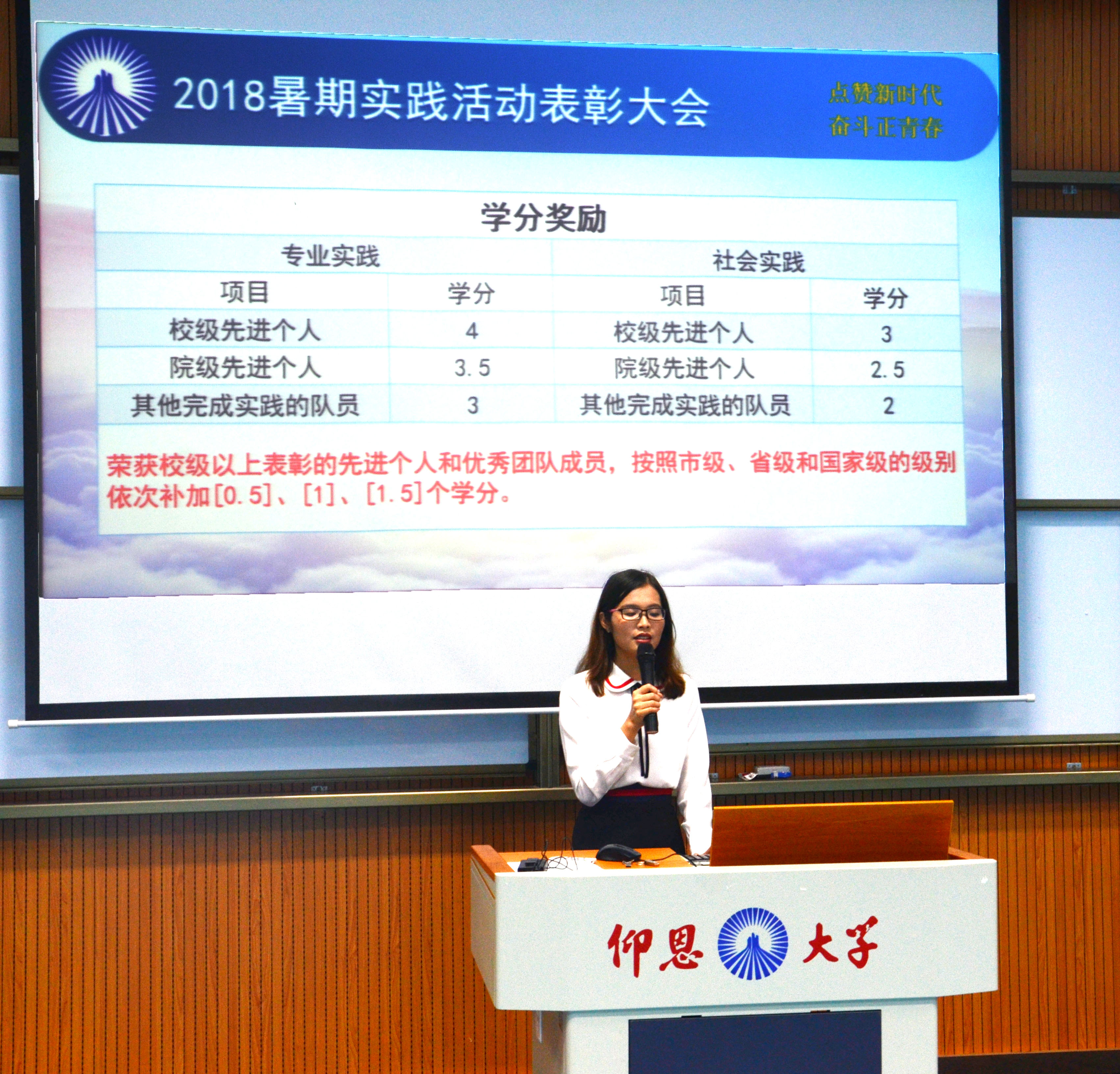 活动现场 朱婷老师首先对本次暑期实践活动做总结报告,汇报了学院取得的成绩,3支队伍获得校级先进团队,2支队伍进入省级先进团队评选,开云kaiyun体育获得暑期实践优秀组织单位。同时,让2018级的新生提前了解暑期实践的相关内容,为明年的暑期实践工作做准备。