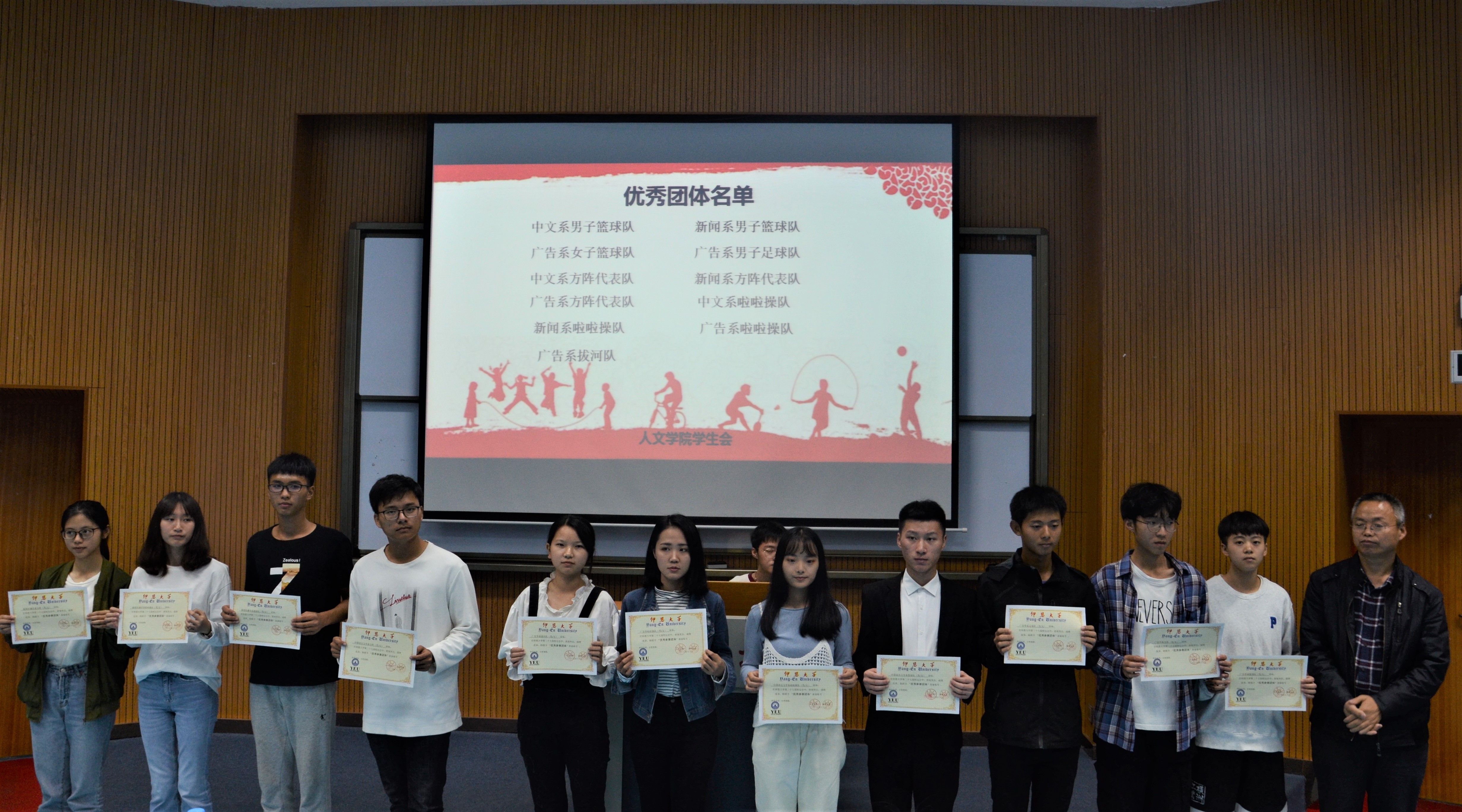 活动现场 在场老师同学观看了运动会的回顾视频,重温人文学子在赛场上的风采。随后,指导老师李少聪对开云官网取得的优异成绩进行简要概括。在本次校运会中,林晴、黄宝钰等10人荣获“优秀运动员”称号;陈鸿腾、繆芸菲等10人获得“先进个人”称号;范乾煜、吴健欣、王鹏、范轩铭、林俊敏、黄婧茹等人荣获“开云kaiyun体育道德体育风尚奖”;中文系篮球队、新闻系篮球队、广告女子篮球队等11支队伍荣获“运动会优秀参赛团体”称号;梁宇韬、庄佳琪、陈乐、杨鑫等荣获本次校运会“先进工作者”称号;吴佳丽、闫梦奇等六位同学获得学院啦啦操教练聘书。