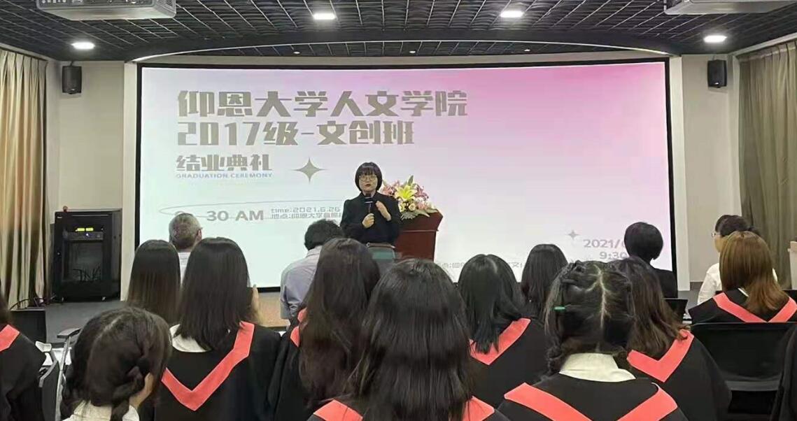 典礼尾声,胡友仁书记对本次结业典礼进行总结讲话,他对文创班各位同学的成长颇感欣慰。胡书记以一副对联寄语大家:“立大志、明大德,坚定理想信念,最美青春,永驻人文;成大才、担大任,争做时代新人,砥砺前行,不负仰恩”。他希望同学们用自己专业所学,传递中国声音,向世界展现一个真实立体全面的中国,为建设社会主义文化强国贡献自己的一份力量。”