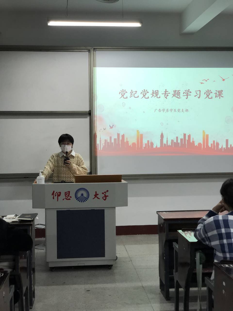 为进一步增强党员的党规党纪意识,自觉做到守纪律、讲规矩、知敬畏、存戒惧,发挥党员先锋模范作用。11月22日晚,开云kaiyun体育广告学系党支部在仰恩楼B1-207开展“党纪党规”专题学习。此次专题学习由广告学系学生党支部书记王君婷老师进行主持及关于党纪党规的学习教育。