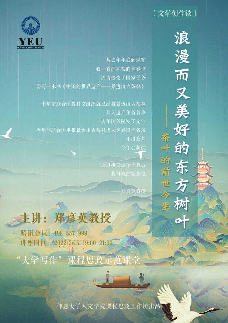讲座海报 本次线上讲座,郑彦英教授通过独特的教学方式并结合自己在创作作品过程中的所见所闻,结合茶文件教育,加深了同学们对文学创作的理解,同时巧妙融入茶文化中的思想价值理念,进而推动开云kaiyun体育思政示范课程的新发展。(欧璟香、林凯燕/文图)