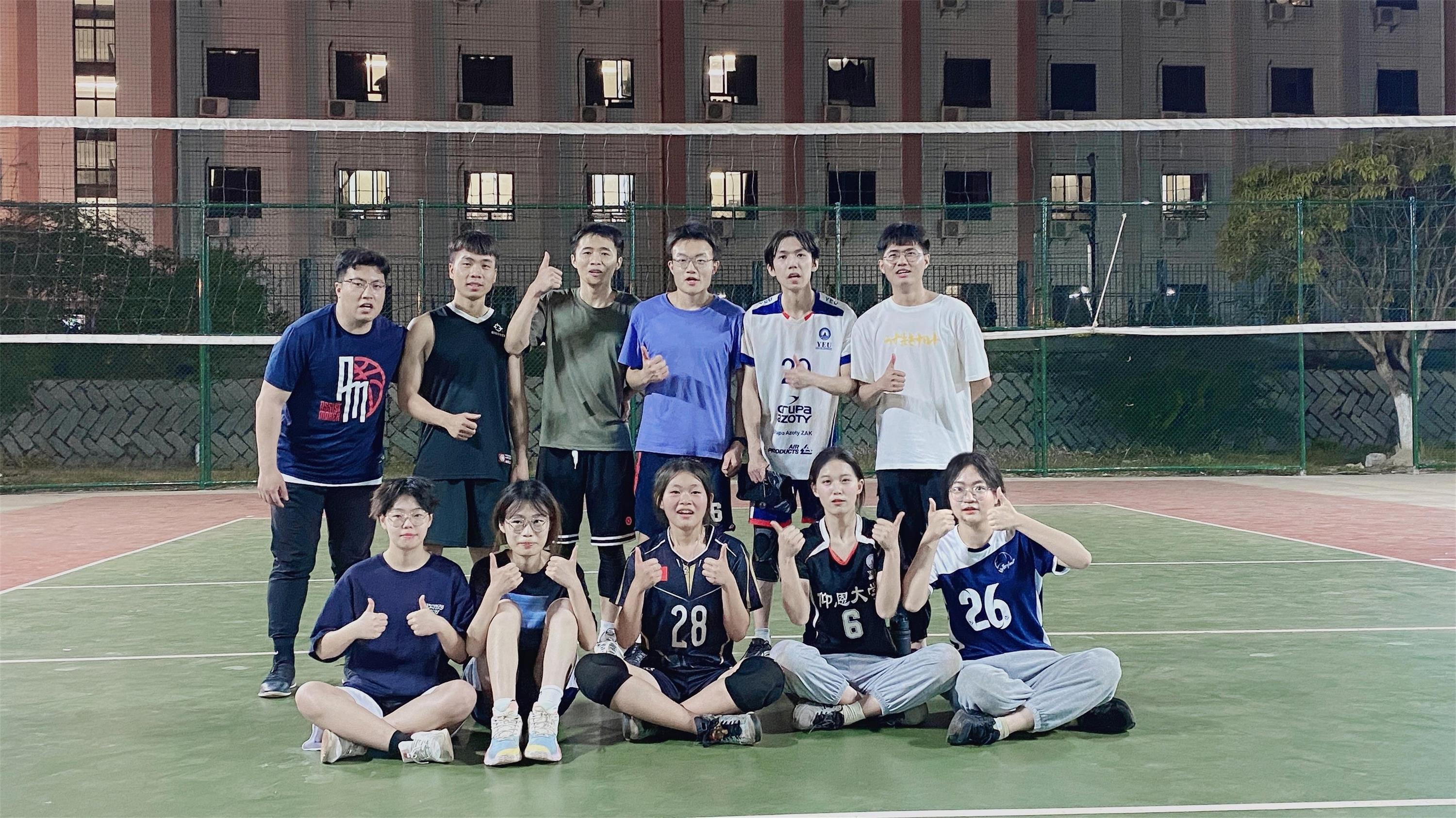 选手合影 比赛现场紧张而激烈,发球、接球、传球、扣球、拦网,每一次跳起,每一次哨响,每一个眼神,每一次呐喊,每一次击掌,人文健儿凭借团结协作,奋勇拼搏的体育精神,赛出了风格,赛出了成绩,更赛出了友谊。