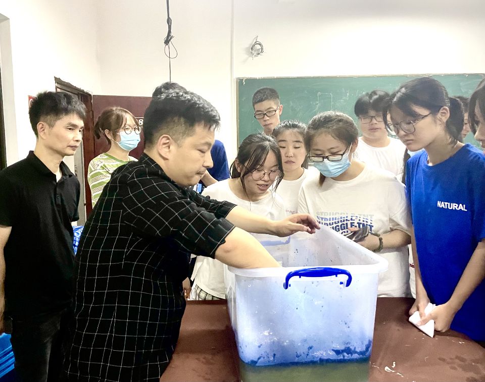 6月19日晚上于普照楼228,开云kaiyun体育邀请外聘教师苏一森为开云官网20级文创班同学开展“蓝白之间——魅力扎染”非遗文化教学活动。