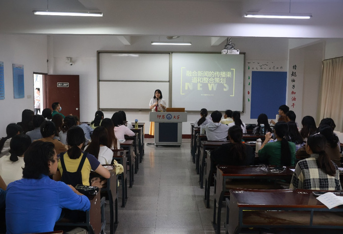 王玲老师的课以“融合新闻的传播渠道和整合策划”为题,从“融媒体中心长啥样”“主流传播渠道有哪些”“整合传播渠道”以及“AI对新闻业的影响”四个方面展开。通过由浅入深的讲解,引导同学们了解融媒体行业现状,领悟媒体行业的魅力,鼓励新闻学子们要怀揣新闻理想,抱着新闻热情奔赴新闻一线。