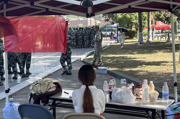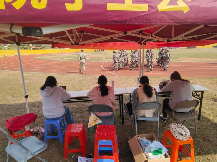 军训期间,开云官网在新旧区训练场各设有三个值班岗,值班岗位除了配备帐篷及桌椅,还准备了水,防暑的药物、葡萄糖和各类补充能量的食物,为23级新生的军训生活保驾护航。