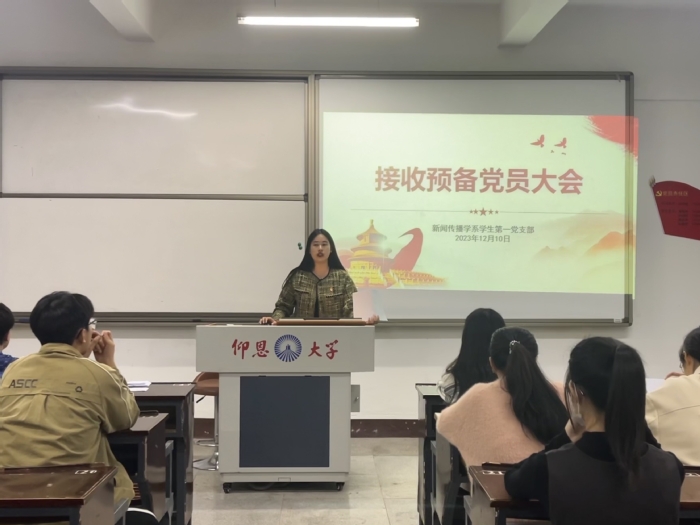12月10日19:30新闻传播学系学生第一党支部于仰恩楼A1-103召开预备党员接收大会,参加本次会议的有发展对象、新闻传播学系学生第一党支部全体党员。大会主要围绕接收雷文彬、陈楠、黄诗婷、林俊杰、毛棋、杨梓涵、陈晶为中共预备党员为主题,讨论并且决定发展对象成为中共预备党员的相关问题。此次会议由支部书记江雯茜主持。