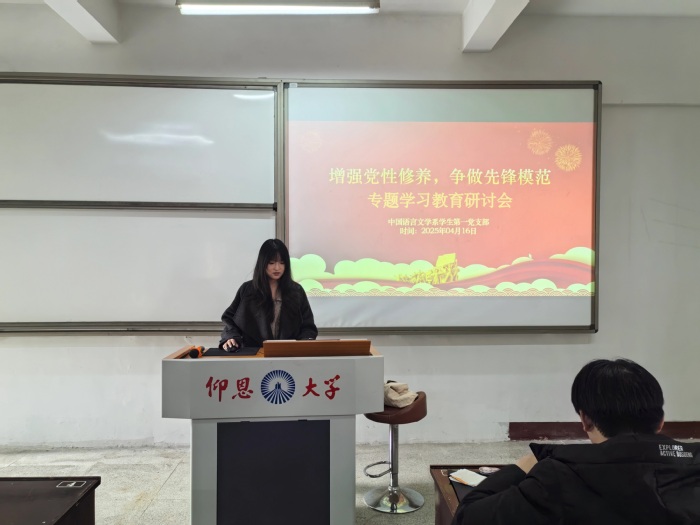 2025年 4月16日下午,中国语言文学系学生第一党支部于仰恩楼A1-107开展“增强党性修养,争做先锋模范”的专题学习教育研讨会,此次专题学习教育研讨会旨在进一步提升支部党员的党性觉悟,激励大家在学习和生活中发挥先锋模范作用。支部书记赵潇潇出席此次活动。