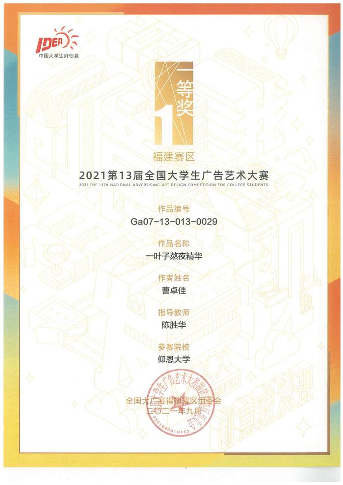 学院高度重视学生实践能力与创新精神培养,积极鼓励学子们参与各类赛事。新闻学专业学生在各类学科竞赛、创新创业项目中成绩斐然。近些年来,在新闻学专业教师组织指导下,学生参加全国大学生广告艺术大赛、“互联网+”大学生创新创业大赛等赛事,多次斩获国家级、省级奖项。在全国大学生广告艺术大赛中,新闻学子获得全国二等奖和三等奖各1项,省级一等奖多项,省级二、三等奖各几十项,2019级新闻学专业郑龙森同学获得2021年福建省“互联网+”大学生创新创业大赛高校主赛道的银奖。