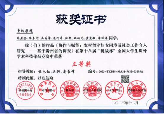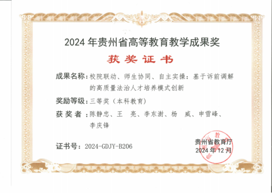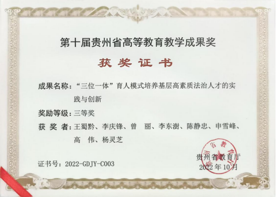 教师在全国高校教师教学创新大赛中获得三等奖1项,贵州省高校教师教学创新大赛中获得一等奖1项、二等奖4项。获批教育部供需对接就业育人项目1项,贵州省高等教育教学成果奖三等奖2项。