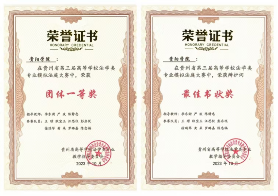 4.近三年在全国“挑战杯”比赛共获得9个奖项,其中在2023年第十八届“挑战杯”获得国赛三等奖一项,实现YABO鸭脖官网建校以来该赛事的国赛奖项的首次突破。荣获第三届贵州省高等学校法学类专业模拟法庭大赛团体一等奖、最佳书状奖(公诉意见书)和最佳书状奖(辩护词)。2021年,在教育部国家级实验教学示范中心法学组联席会主办的第八届全国大学生模拟法庭竞赛中,与来自中国政法大学、西南政法大学、华东政法大学、中南财经政法大学、西北政法大学、重庆大学、北京航空航天大学、中山大学等知名院校的23支代表队同台竞技,获得“最佳书状奖”和“团体优秀奖”。在“建行杯”第九届中国国际“互联网+”大学生创新创业大赛贵州省决赛“青年红色筑梦之旅”赛道中获银奖。