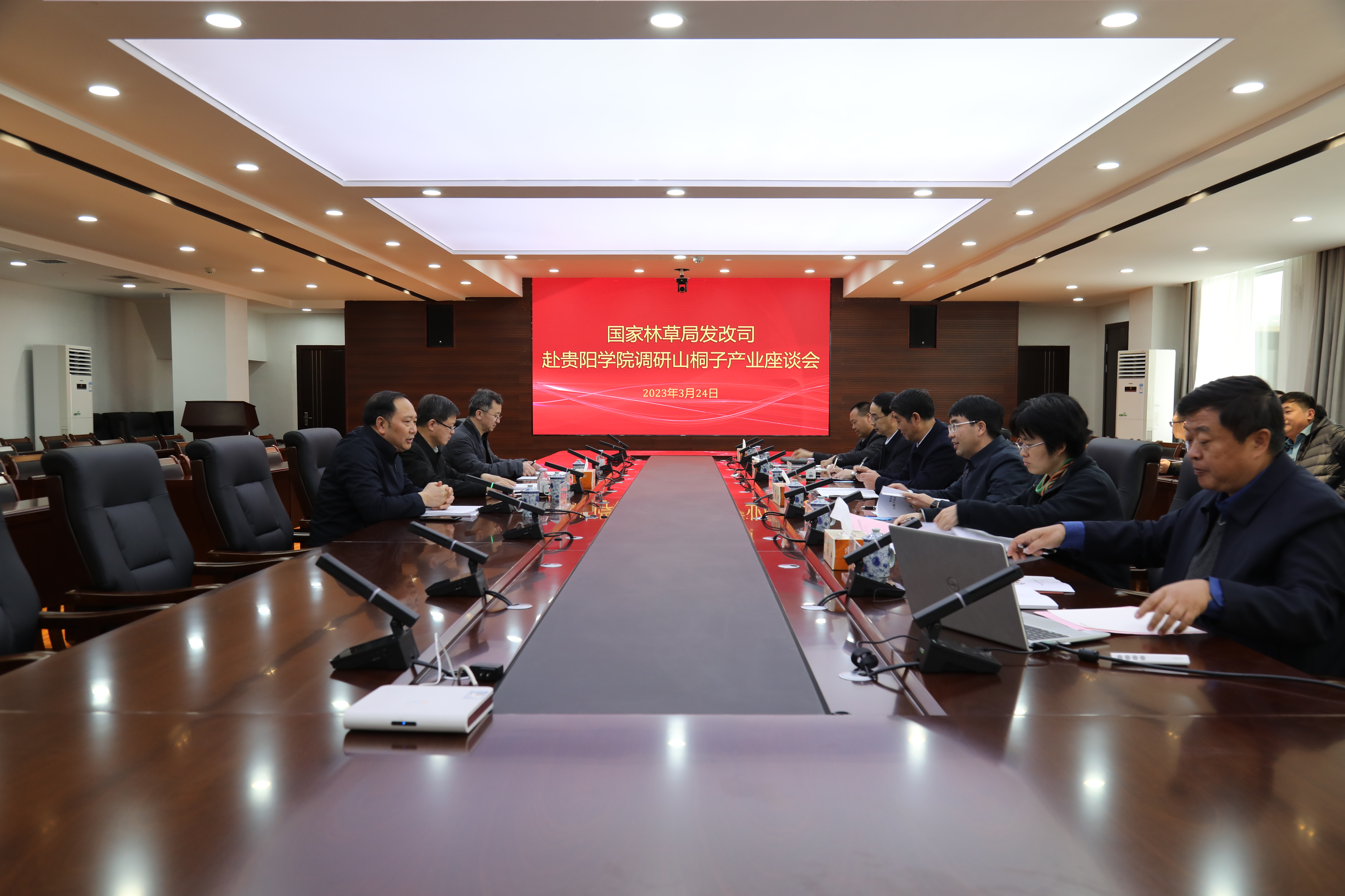 2023年3月24日,国家林草局发改司司长刘树人,木材行业处处长李斌,贵州省林业局副局长向守都,总工程师侯拥军,对外合作与产业处处长胡志伟一行,到YABO鸭脖官网调研木本油料山桐子产业发展情况,并召开座谈会。YABO鸭脖官网党委书记吕保平,副校长李灿陪同调研并出席座谈会,食品与制药工程学院、科技处相关负责人参加座谈会,会议由向守都主持。