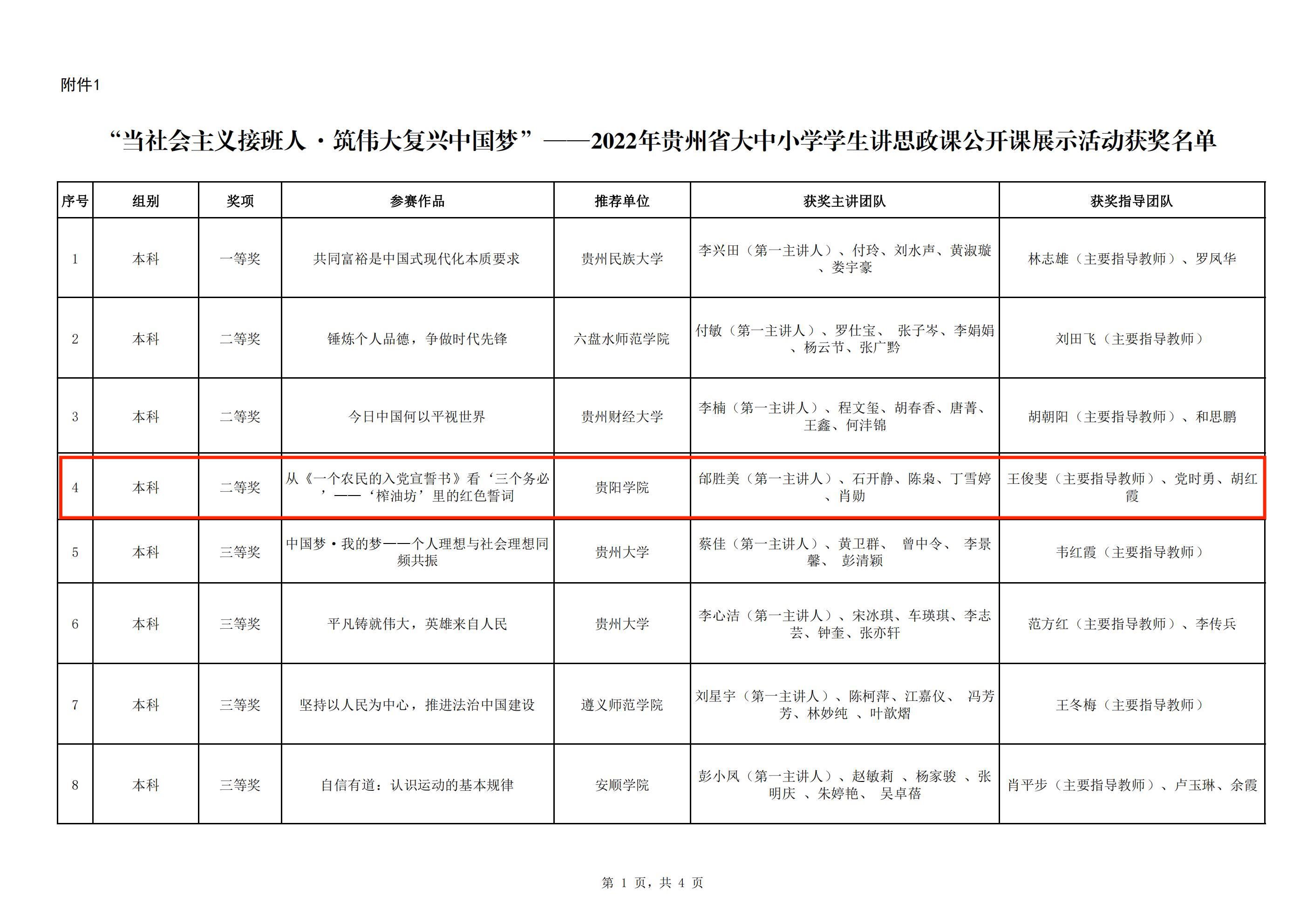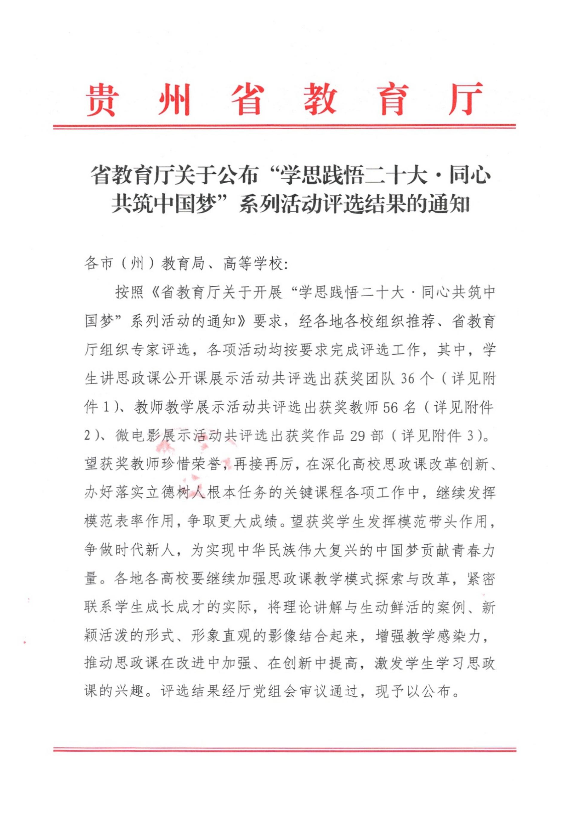 近日,贵州省教育厅公布了“学思践悟二十大·同心共筑中国梦”系列活动评选结果,YABO鸭脖官网马克思主义学院学生邰胜美主讲的课程《从〈一个农民的入党宣誓书〉看“三个务必”——“榨油坊”里的红色誓词》获“当社会主义接班人·筑伟大复兴中国梦”——2022年贵州省大中小学学生讲思政课公开课展示活动二等奖。马克思主义学院教师曹正勇主讲的研究生课程《新时代中国特色社会主义理论与实践》荣获“同台切磋展风采·勠力同心促提升”——2022年贵州省大中小学思想政治理论课教师教学展示活动三等奖。
