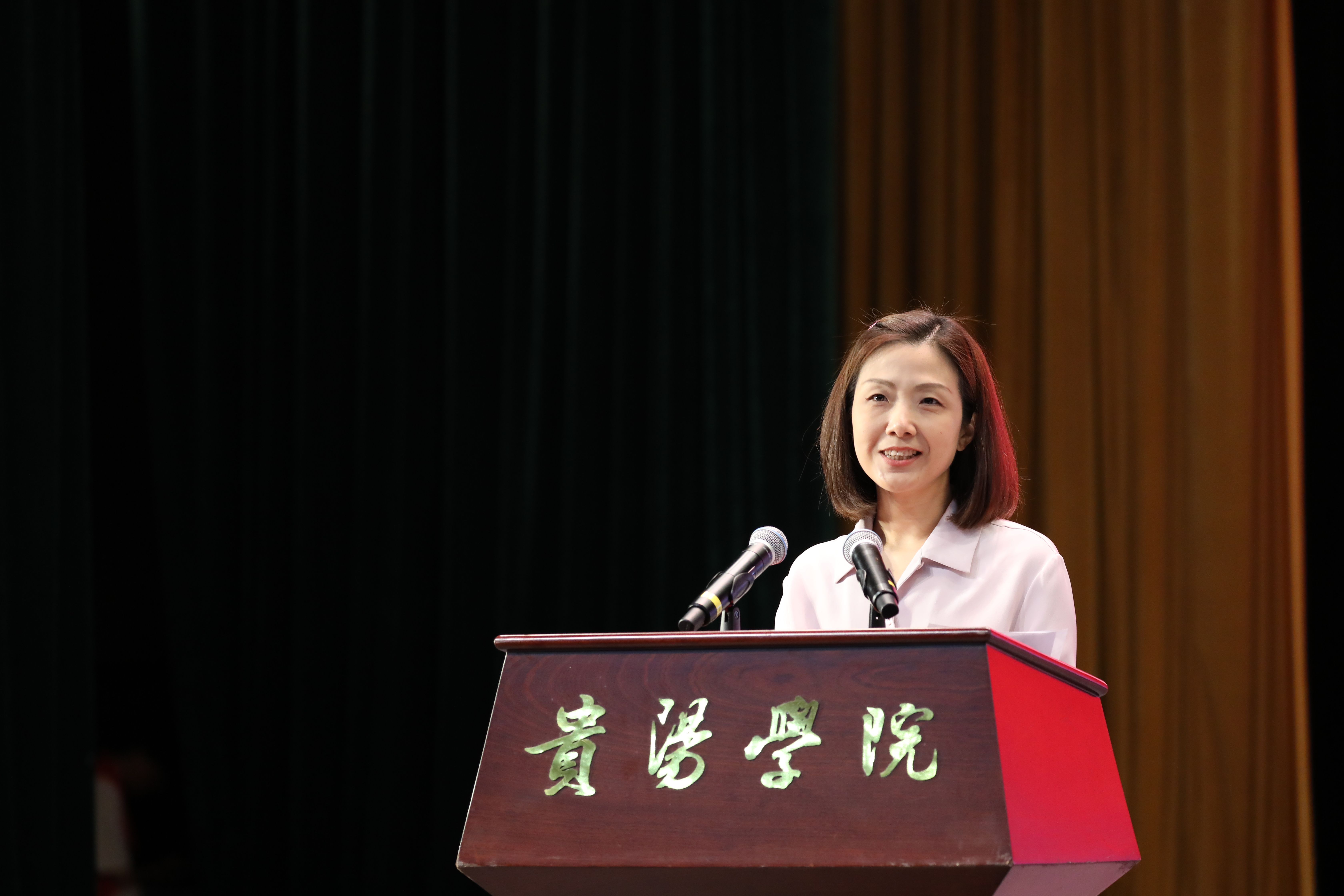 硕士毕业生代表、食品科学与工程学院芈婷婷回顾了三年间在贵院将科研梦想转为现实的筑梦之旅。她说:“光阴似箭,岁月如歌。三年的研究生生活即将结束,让我感慨,亦让我不舍。追风赶月莫停留,平芜尽处是春山。感谢母校给我们提供了一个又一个登高望远的平台,让我们不断努力,携手同行。敬爱的老师们,我们在你们的庇护之下,即将奔向祖国的四面八方!海阔凭鱼跃,天高任鸟飞!每位同窗都会承载自己的梦想奔赴下一场山海。李大钊先生曾说过,‘以青春之我,创建青春之家庭,青春之国家,青春之民族,青春之人类,青春之地球,青春之宇宙,资以乐其无涯之生。’今天的我们,应以习近平新时代中国特色社会主义思想为指引,投身实现中华民族伟大复兴的宏伟事业,不辜负党的期望、人民的期待、民族的重托,不辜负我们这个伟大的时代。愿我们无论在何方,都心怀梦想,坚持热爱,牢记母校‘博、新、雅、信’的校训,以最饱满的热情去勇敢地面对各种挑战!”