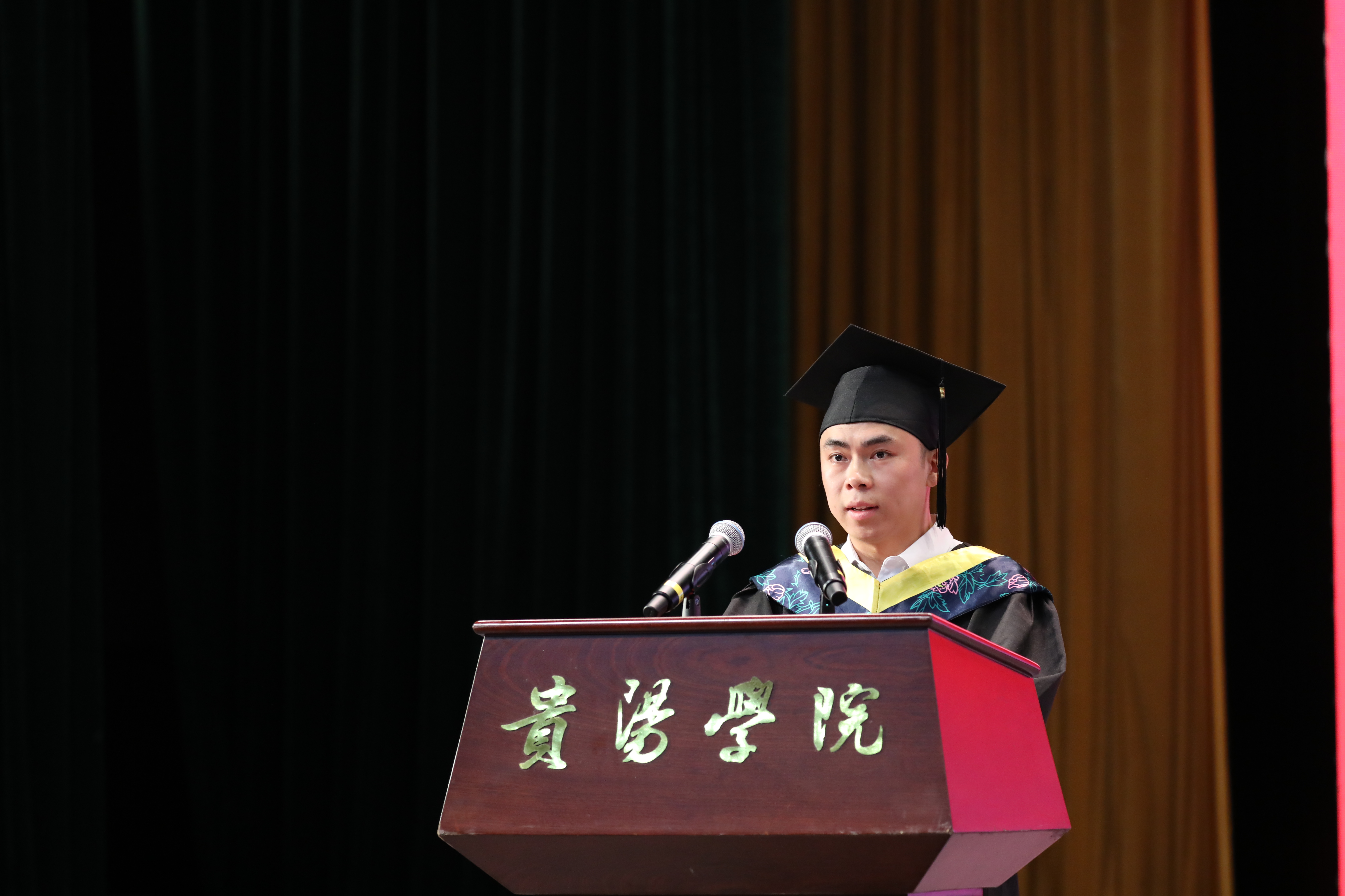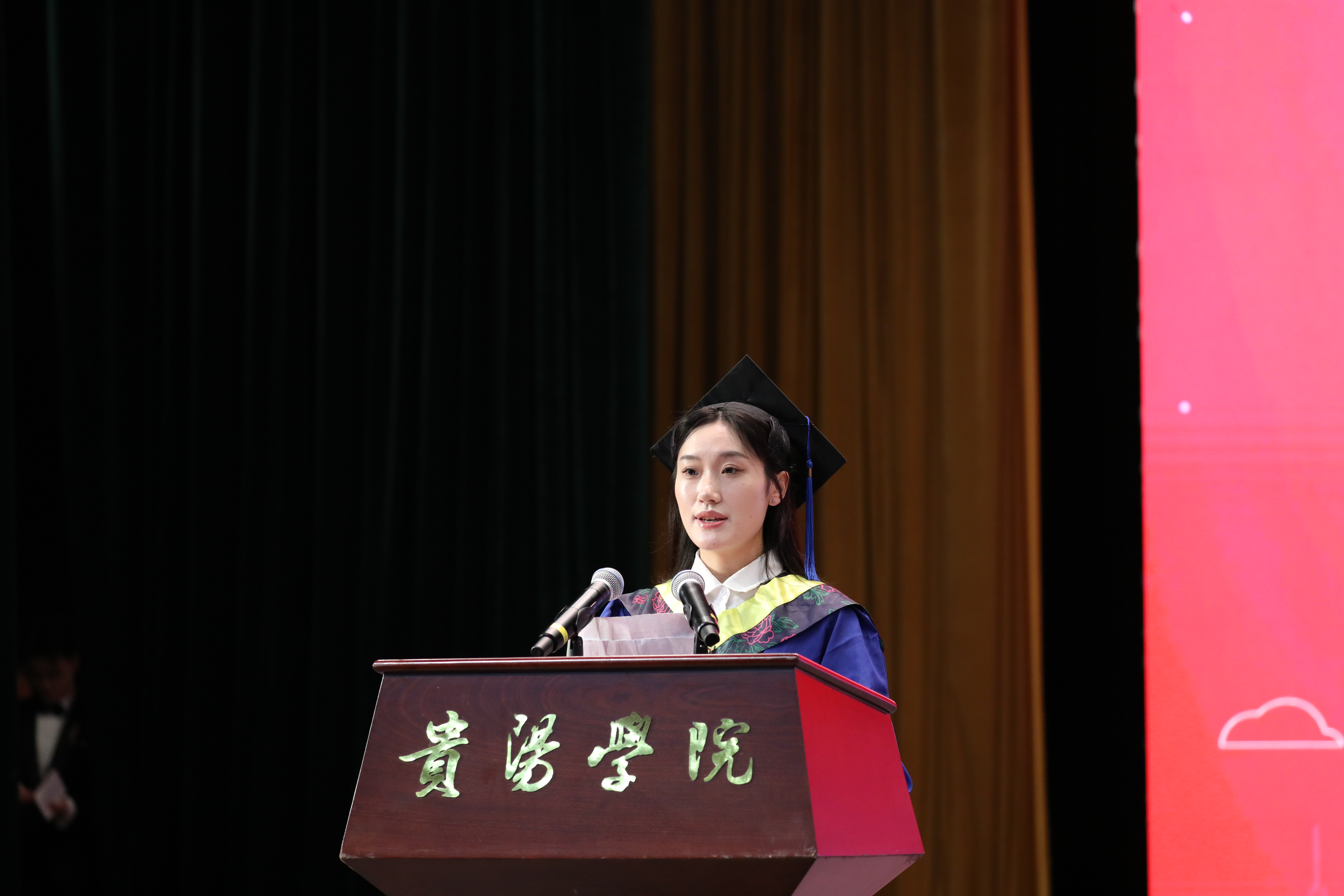 本科毕业生代表、建筑科学与工程学院陈俊国讲述了在贵院四年的自我发现之旅。他说:“时光如水,记忆如磐。回首四载春秋寒暑,一千多个日日夜夜,经过懵懂迷茫的大一,走过热情奔放的大二,进入紧张忙碌的大三,来到了依依别离的大四……一幕幕场景就像一张张绚丽的剪纸画,串成一部即将谢幕的电影,记录着我们的青春与过往,承载着我们在母校里的点点滴滴与成长。岁月安好,不负时光,我们永远不会忘记“博、新、雅、信”的校训以及‘学为君子,兼善天下’的教育理念。作为新时代的青年学子,我们有责任肩负起新时代的重任,不负时代,不负韶华,成为新时代奋勇前进的搏击者,带着母校的期望、老师们的教诲、朋友们的鼓励,砥砺前行,做怀揣梦想脚踏实地的人、做拥有智慧富有激情的人、做德才兼备敢挑重任的人,以青春之名,赴时代之约。”