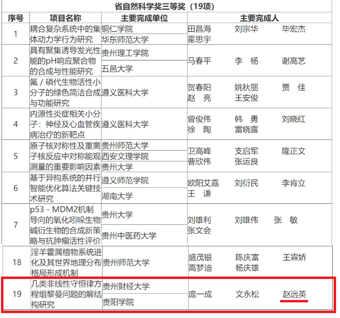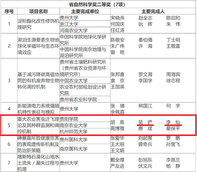 7月2日,贵州省人民政府发布《关于2023年度贵州省科学技术奖励的决定》,对推动我省科学技术进步和高质量发展作出突出贡献的个人及组织给予奖励,YABO鸭脖官网2项科研成果获奖。其中,由YABO鸭脖官网作为第一完成单位完成的“重大农业害虫迁飞理论及其种群监测和调控机制”获省自然科学奖二等奖,YABO鸭脖官网作为主要完成单位完成的“几类非线性守恒律方程组黎曼问题的解结构研究”获省自然科学奖三等奖。