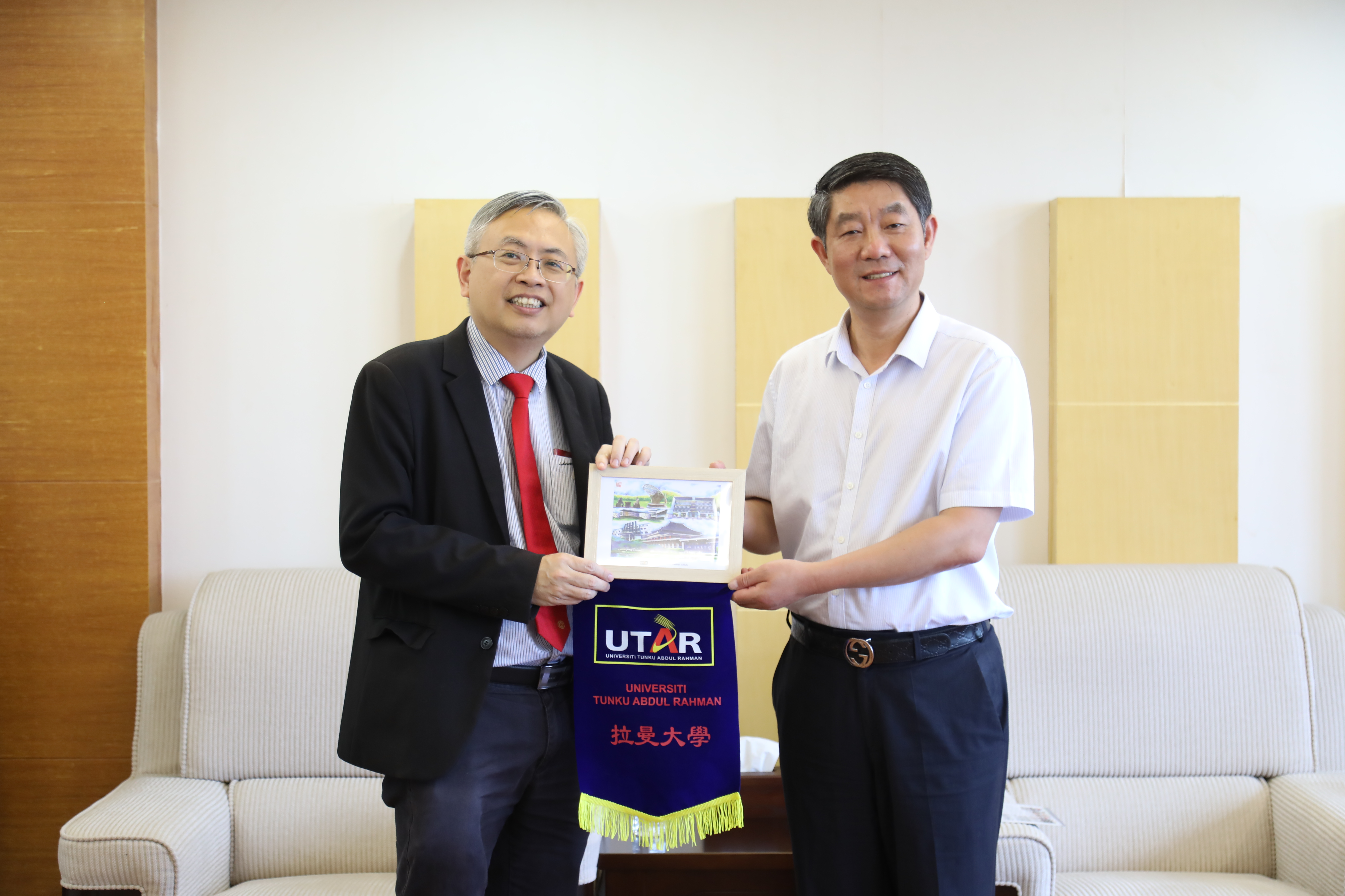 8月22日,校党委书记吕保平在九思楼贵宾室会见马来西亚拉曼大学校长拿督尤芳达,国际事务处处长赖顺安,洽谈两校教育合作交流。