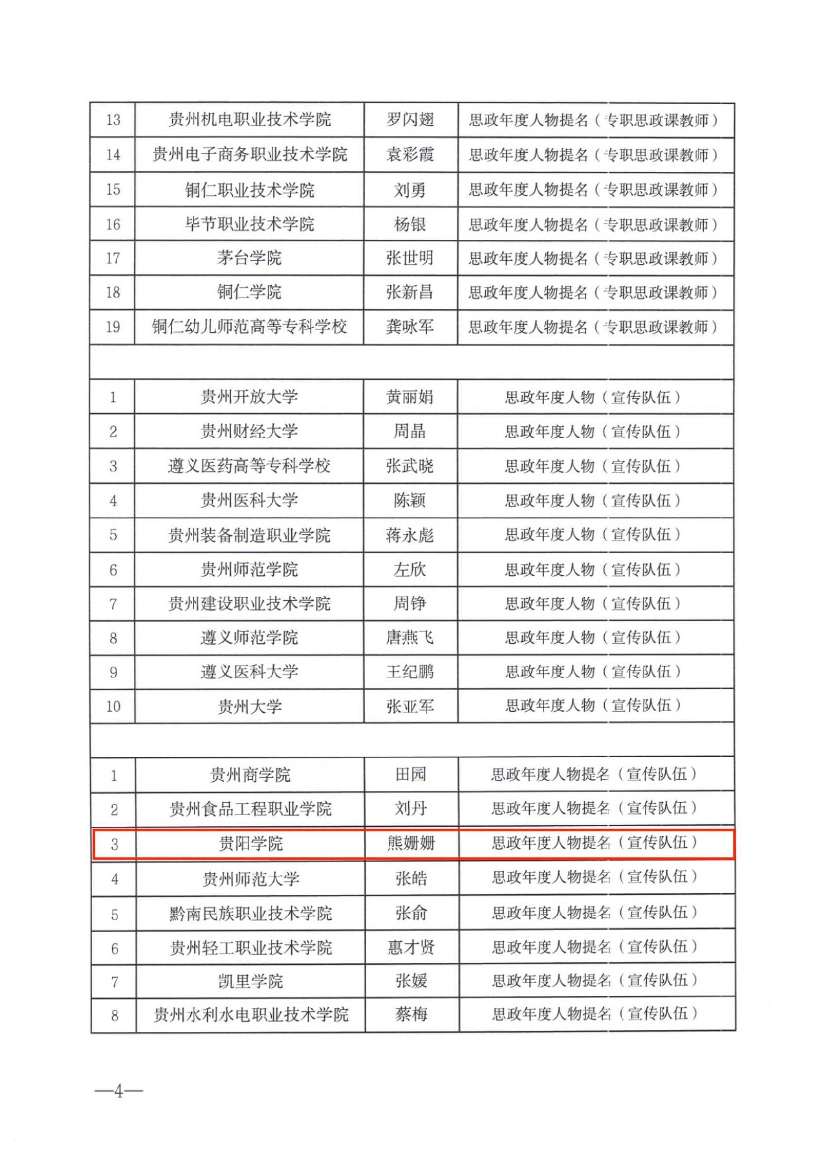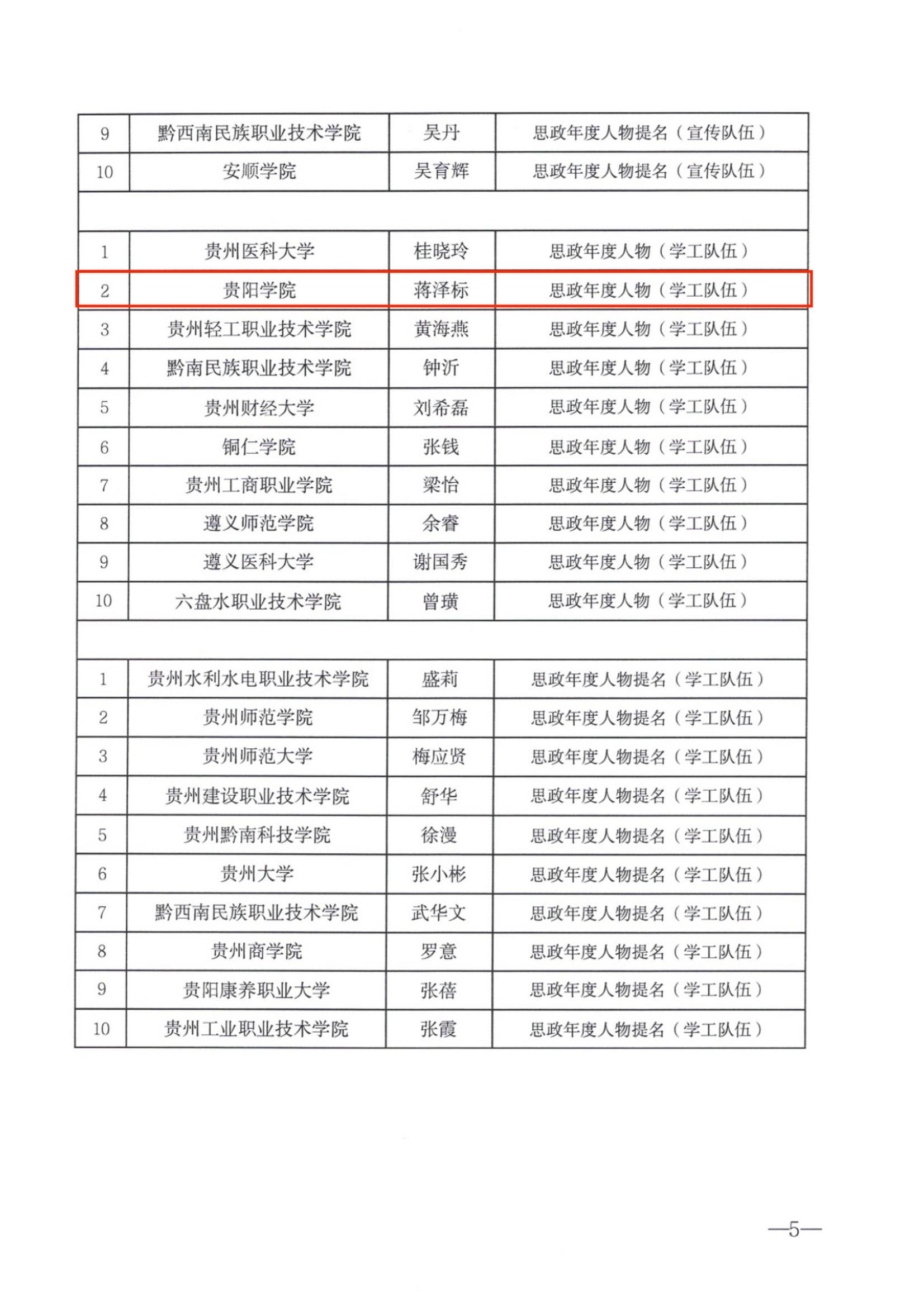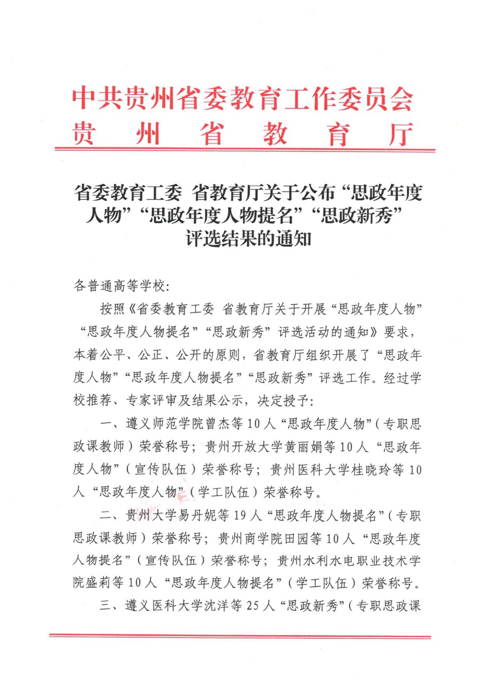 近日,省委教育工委、省教育厅正式印发《省委教育工委 省教育厅关于公布“思政年度人物”“思政年度人物提名”“思政新秀”评选结果的通知》,YABO鸭脖沈雪蓓老师获“思政年度人物(专职思政课教师)”、熊姗姗老师获“思政年度人物提名(宣传队伍)”、蒋泽标老师获“思政年度人员(学工队伍)”、唐薇老师获“思政新秀(宣传队伍)”、郑传捷老师获“思政新秀(学工队伍)”。
