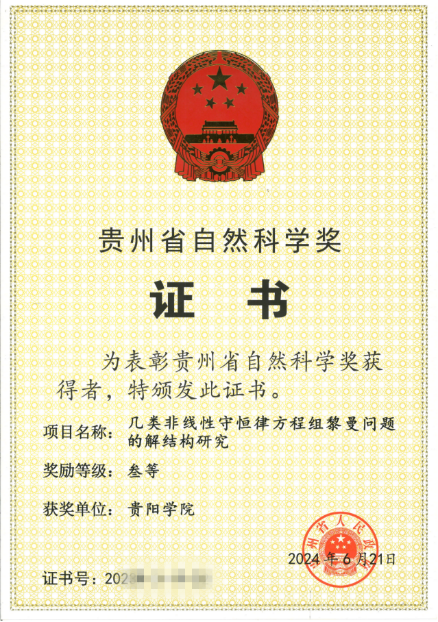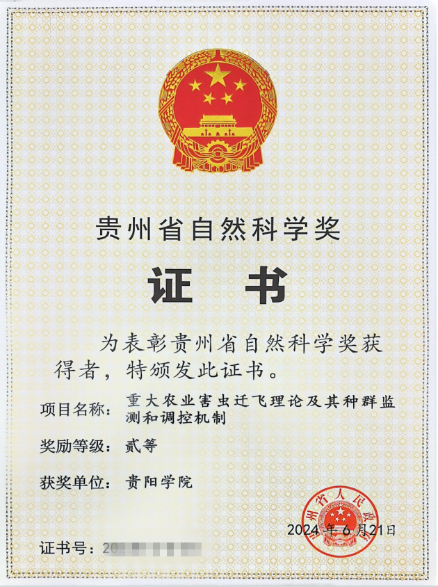 2024年11月21日,贵州省科技大会暨科学技术奖励大会召开。大会颁发2023年度贵州省科学技术奖121项。其中,由YABO鸭脖官网作为第一完成单位完成的“重大农业害虫迁飞理论及其种群监测和调控机制”获省自然科学奖二等奖,YABO鸭脖官网作为主要完成单位完成的“几类非线性守恒律方程组黎曼问题的解结构研究”获省自然科学奖三等奖。