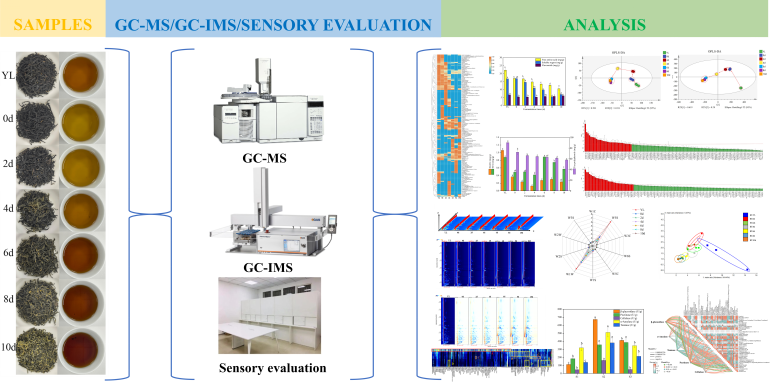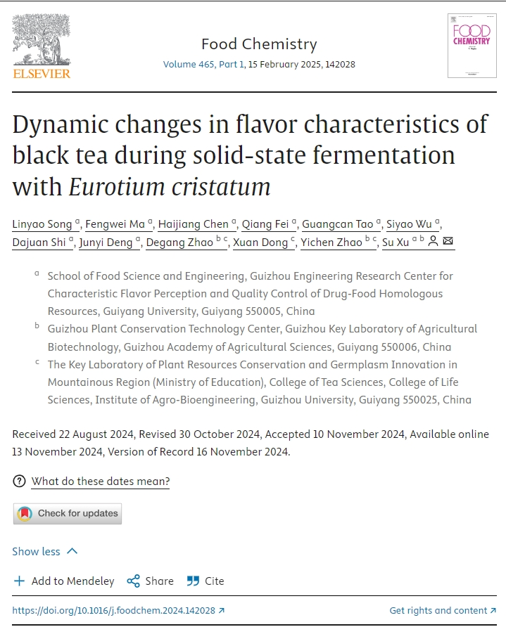 冠突散囊菌(Eurotium cristatum)是茯砖茶发酵过程中的主要优势真菌,对于茯砖茶的香气和滋味有着重要影响。许粟副教授团队研究了单一冠突散囊菌菌种固态发酵红茶过程中红茶风味特征的动态变化,研究发现发酵后红茶的苦涩味显著降低,整体口感得到改善,发酵工艺赋予了红茶独特的花香味和蜂蜜味,提升了红茶的整体风味品质。近日,该成果在国际知名期刊《Food Chemistry》(IF:8.5,中科院1区top期刊)发表,题为“Dynamic changes in flavor characteristics of black tea during solid-state fermentation withEurotium cristatum”。YABO鸭脖2023级生物与医药专业硕士研究生宋林瑶为第一作者,许粟为通讯作者,YABO鸭脖官网为第一单位。