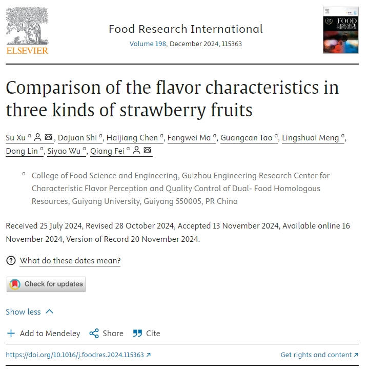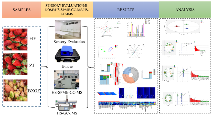 草莓是一种重要的经济作物,各品种在味道、香气和营养价值上存在显著差异。因此,区分和表征不同的草莓品种以评估其品质已成为需要关注的紧迫问题。本研究通过感官评价、理化分析、电子鼻、HS-SPME-GC-MS和HS-GC-IMS评估了三个草莓品种(红颜、章姬、白雪公主)的风味特征。结果表明,章姬草莓甜度最高,而红颜草莓甜度最低。白雪公主草莓的维C、总酚和黄酮类化合物浓度最高。此外,在红颜、章姬和白雪公主草莓中分别鉴定出18、30和33种香气活性值(OAV)大于1的挥发性有机化合物。根据偏最小二乘判别分析(PLS-DA)的结果,3个理化指标、使用HS-SPME-GC-MS检测到的18种挥发性有机物和使用HS-GC-IMS检测到的26种挥发性有机物被确定为潜在的生物标志物。这些发现为草莓品种之间风味差异的鉴别提供了有价值的见解,并建立了一种使用GC-IMS快速分析草莓果实香气的方法。该成果近日在在国际知名期刊《Food Research International》(IF:7.0,中科院1区top期刊)发表,题为“Comparison of the flavor characteristics in three kinds of strawberry fruits”。学校副教授许粟为第一作者,2023级生物与医药专业硕士研究生史大娟为第二作者,副教授许粟、费强为共同通讯作者,YABO鸭脖官网为唯一单位。
