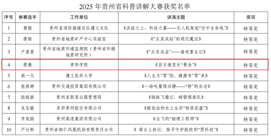 由贵州省科技厅举办的“2025年贵州省科普讲解大赛”于近期公布了获奖名单。经半决赛和总决赛评比,学校师生凭借生动的讲解技巧和新颖的内容设计斩获特等奖1项,三等奖2项。