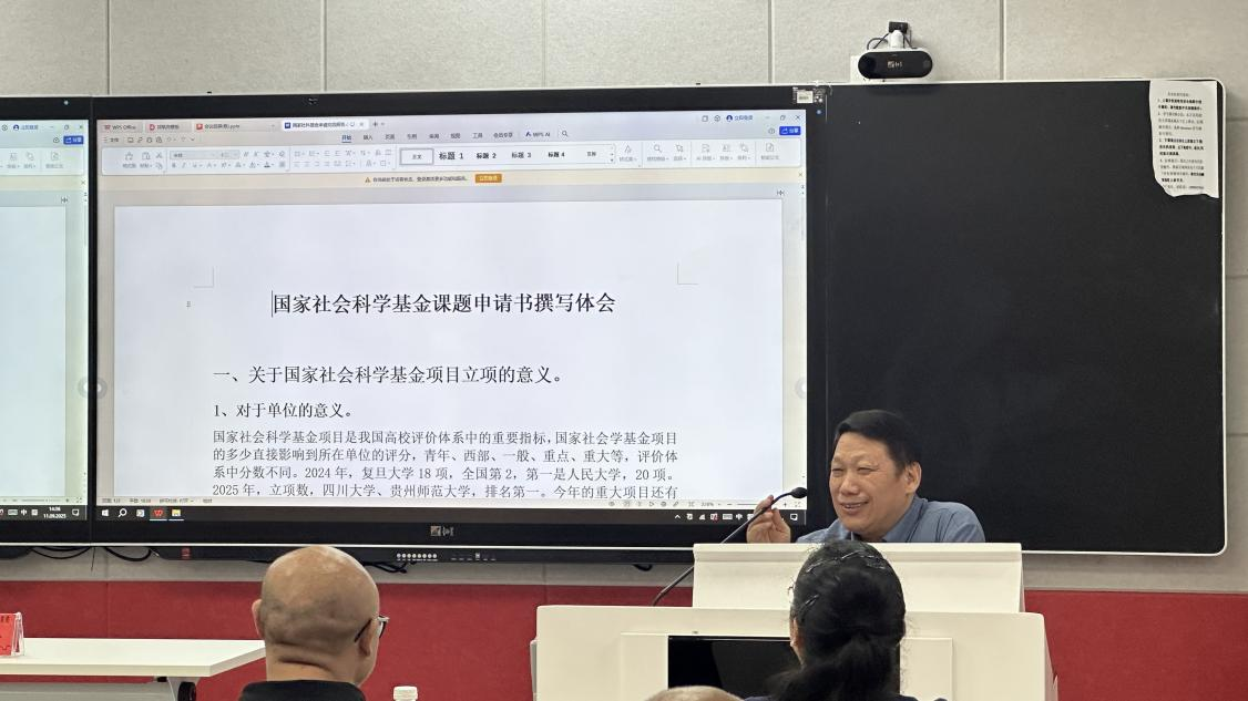 讲座现场,李承贵教授围绕国家社科基金项目申报与立项的重要意义、申请书的撰写技巧及申报成功的关键要素等方面进行了系统讲解。他重点强调了选题创新、范本借鉴、细节把控与持续积累在申报中的重要作用。讲座过程中,李教授结合具体案例,就课题组成员的构成、前期研究成果的呈现、参考文献的选取等关键环节与参会教师深入交流,并针对性提出切实可行的建议。