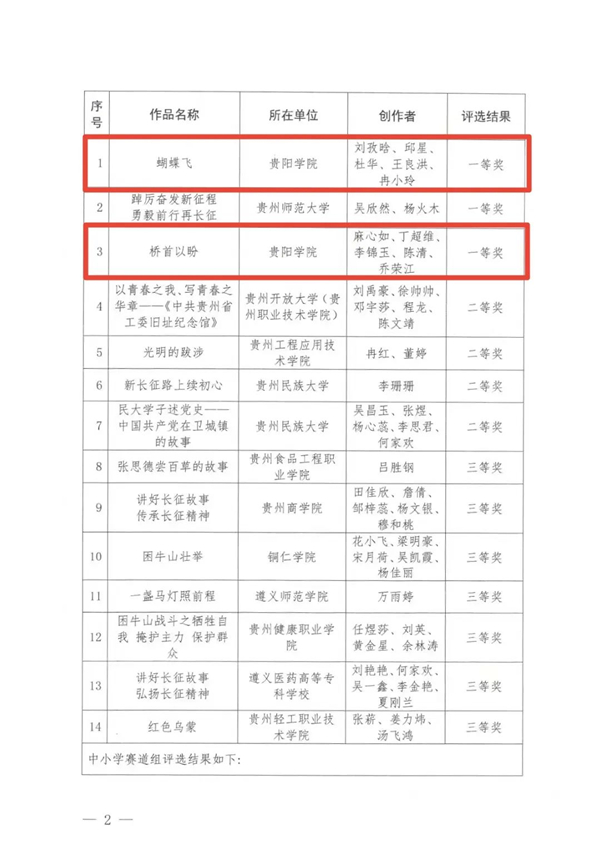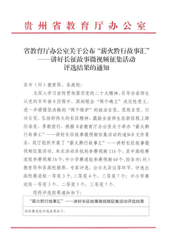 近日,贵州省教育厅组织开展了“薪火黔行故事汇”--讲好长征故事微视频征集活动。此次活动共收到参赛视频116个,其中高校赛道组参赛视频56个,中小学赛道组参赛视频60个。经各市(州)教育局和各高校推荐、专家评选、公示无异议等环节,YABO鸭脖官网学子刘孜晗、邱星、杜华、王良洪、冉小玲的作品《蝴蝶飞》荣获一等奖;学子麻心如、丁超维、李锦玉、陈清、乔荣江的作品《桥首以盼》荣获一等奖。