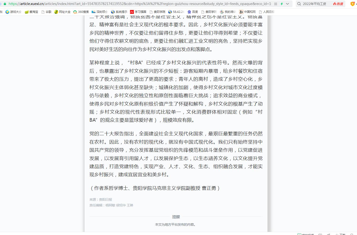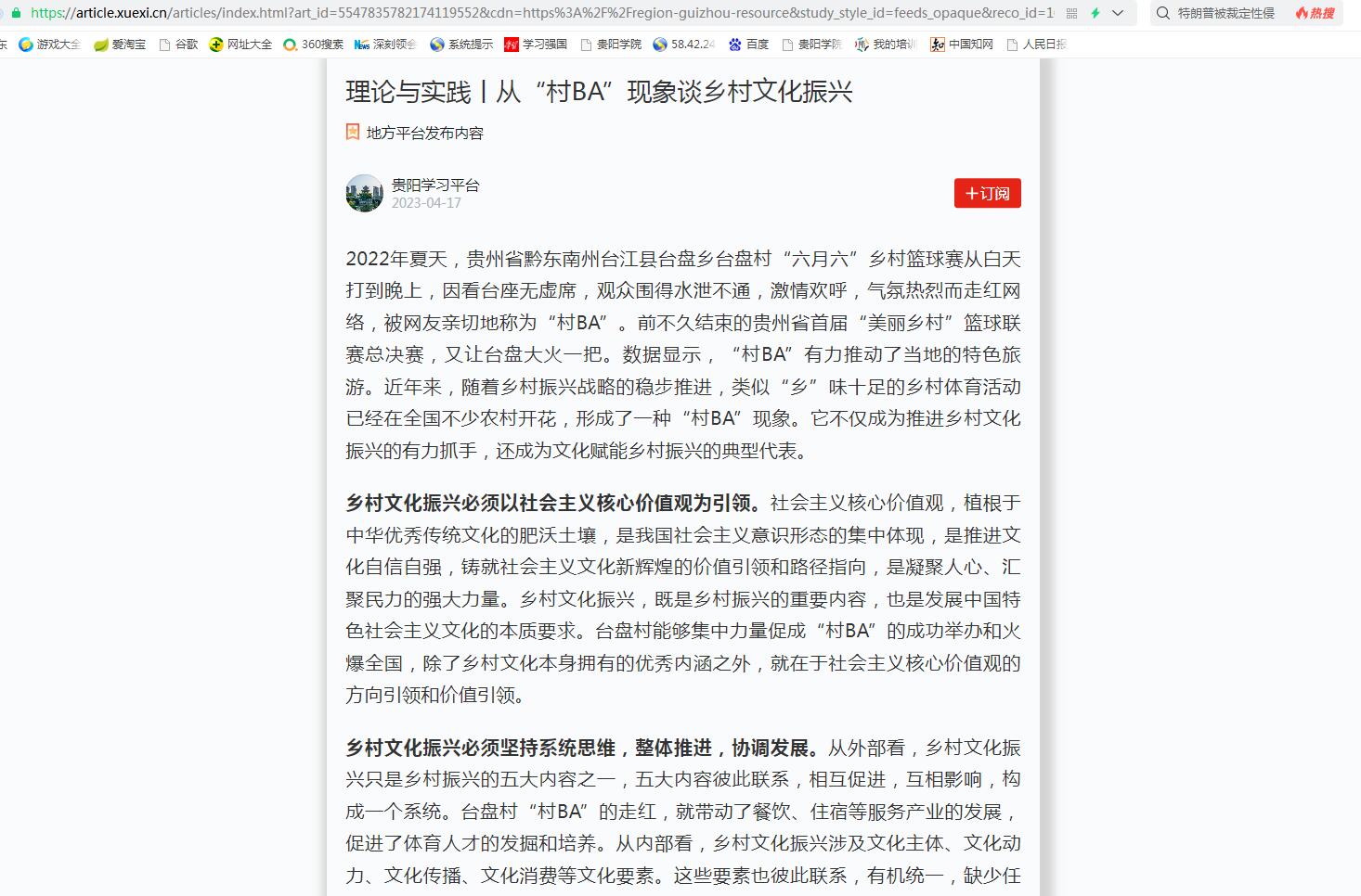 2023年4月17日,YABO鸭脖马克思主义学院副教授曹正勇在贵阳日报发表的文章《从“村BA”现象谈乡村文化振兴》被“学习强国贵阳学习平台采用。