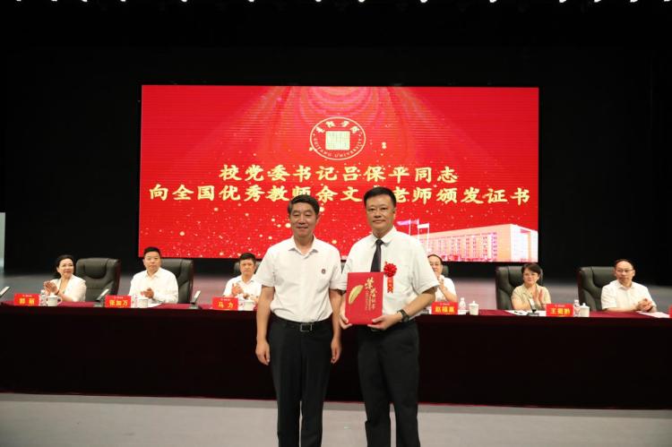 校党委书记吕保平,校领导赵福菓、马力、王蜀黔、张加万、刘清海、郭丽出席表彰大会并讲话,赵福菓主持大会,会议在庄严的国歌声中拉开帷幕。大会上,马力宣读了全国优秀教师获得者名单,刘清海宣读了省级“金师”(教学名师)表彰决定,王蜀黔宣读了优秀教师、优秀教育工作者表彰决定,张加万宣读了优秀辅导员表彰决定。校领导向获得表彰的教职工颁发了获奖证书。