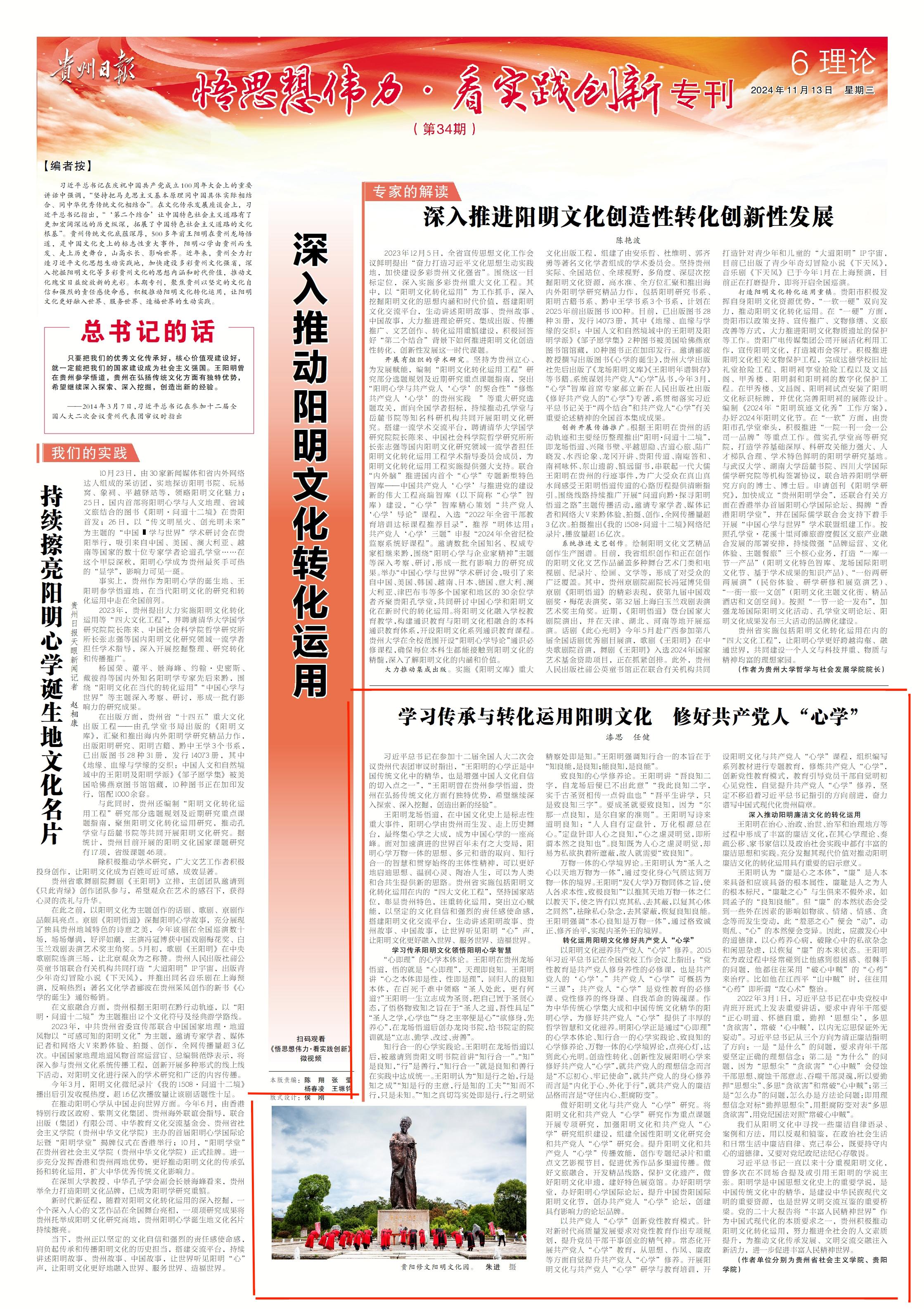 习近平总书记在庆祝中国共产党成立100周年大会上的重要讲话中强调,“坚持把马克思主义基本原理同中国具体实际相结合、同中华优秀传统文化相结合”。在文化传承发展座谈会上,习近平总书记指出,“‘第二个结合’让中国特色社会主义道路有了更加宏阔深远的历史纵深,拓展了中国特色社会主义道路的文化根基”。贵州传统文化底蕴深厚,500多年前王阳明在贵州龙场悟道,是中国文化史上的标志性重大事件,阳明心学由贵州而生发、走上历史舞台,山高水长、影响世界。近年来,贵州全力打造习近平文化思想生动实践地,加快建设多彩贵州文化强省,深入挖掘阳明文化等多彩贵州文化的思想内涵和时代价值,推动文化瑰宝日益绽放新的光彩。本期专刊,聚焦贵州以坚定的文化自信和强烈的责任感使命感,深入推动阳明文化转化运用,让阳明文化更好融入世界、服务世界、造福世界的生动实践。