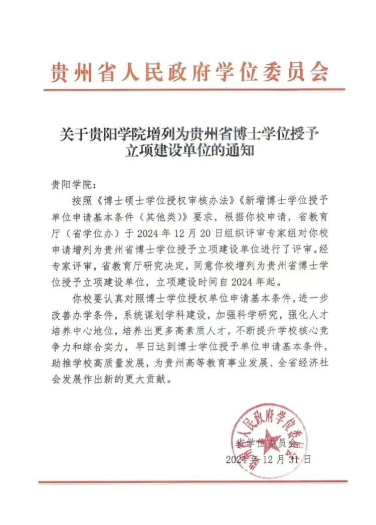 近日,贵州省人民政府学位委员会下发《关于YABO鸭脖官网增列为贵州省博士学位授予立项建设单位的通知》,经专家评审,省教育厅研究决定,同意YABO鸭脖官网增列为贵州省博士学位授予立项建设单位,立项建设时间自2024年起。