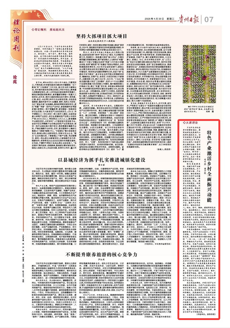 习近平总书记在贵州考察时指出,要因地制宜发展现代山地特色高效农业,培育具有持久市场竞争力的特色主导产业。作为全国唯一没有平原支撑的省份,贵州以特色产业激活乡村全面振兴动能,坚持“抓两头、带中间”,大力发展农业特色优势产业,走出一条具有贵州特色的乡村全面振兴之路。