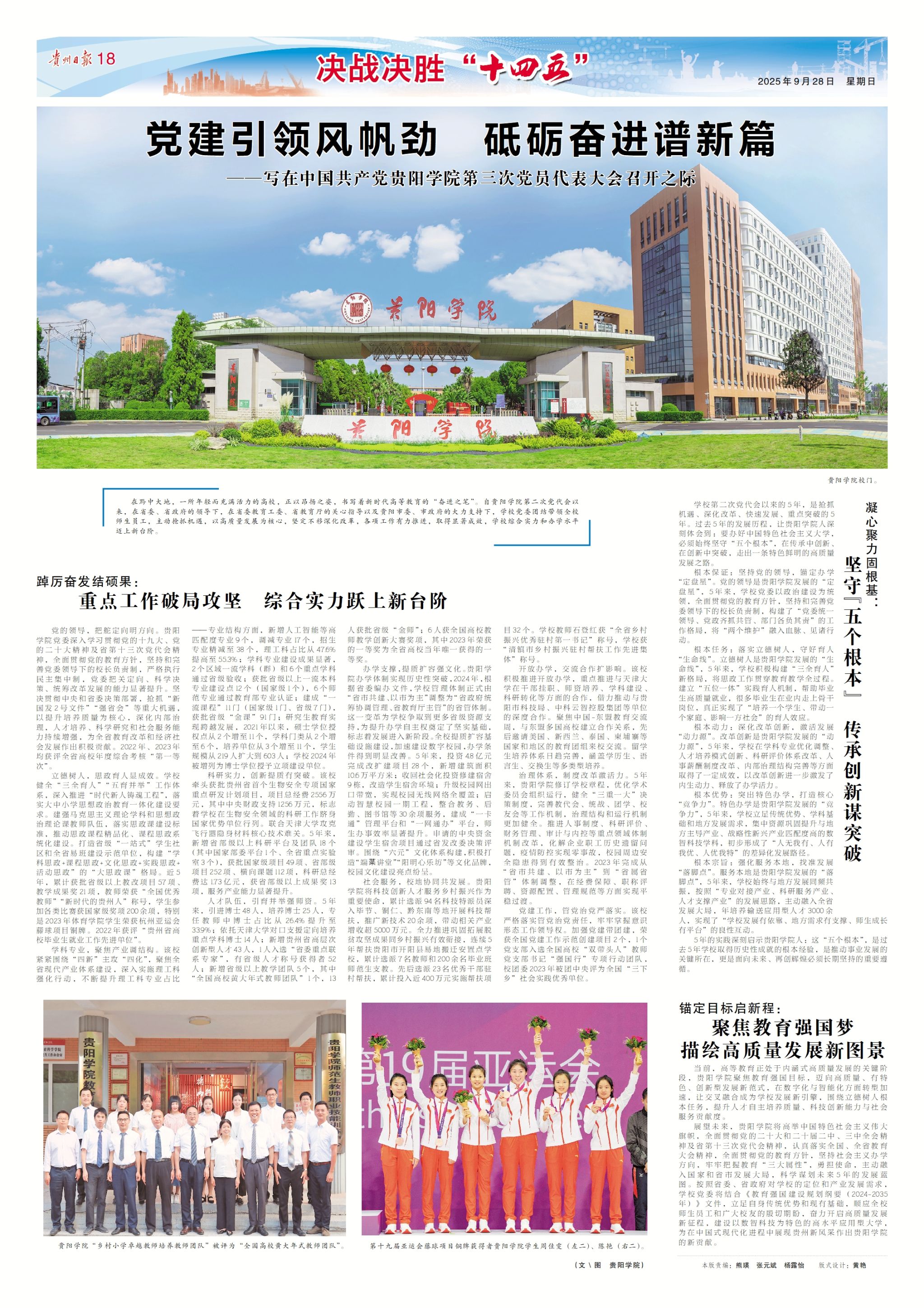 在黔中大地,一所年轻而充满活力的高校,正以昂扬之姿,书写着新时代高等教育的“奋进之笔”。YABO鸭脖官网第二次党代会以来,在省委、省政府的正确领导和省委教育工委、省教育厅的关心指导以及贵阳市委、市政府的大力支持下,学校党委团结带领全校师生员工,主动抢抓机遇,以高质量发展为核心,坚定不移深化改革,各项工作有力推进,取得显著成效,学校综合实力和办学水平迈上新台阶。