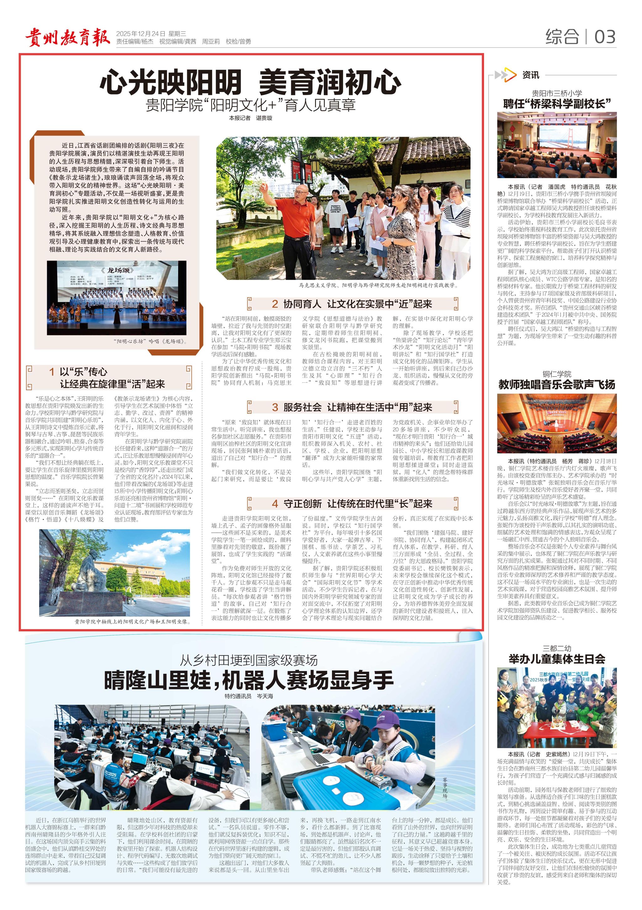 在阳明学与黔学研究院副院长任健看来,这种“道器合一”的方式,正让乐教思想慢慢浸润青年心灵。如今,阳明文化乐教课堂不只是校内的“香饽饽”,还走出校门成了全省的文化名片:2024年以来,他们带着改编的《龙场颂》等走进15所中小学传播阳明文化;阳明心乐坊还亮相贵州省博物馆“阳明・问道十二境”书画展和学校师范专业认证现场,教育部评估专家也为他们点赞。