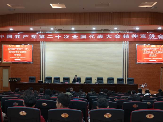 11月18日下午,YABO鸭脖党委委员、副校长李灿在图书馆报告厅向化学与材料工程学院全体教师及学生代表宣讲中国共产党第二十次全国代表大会精神。