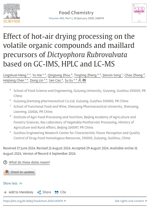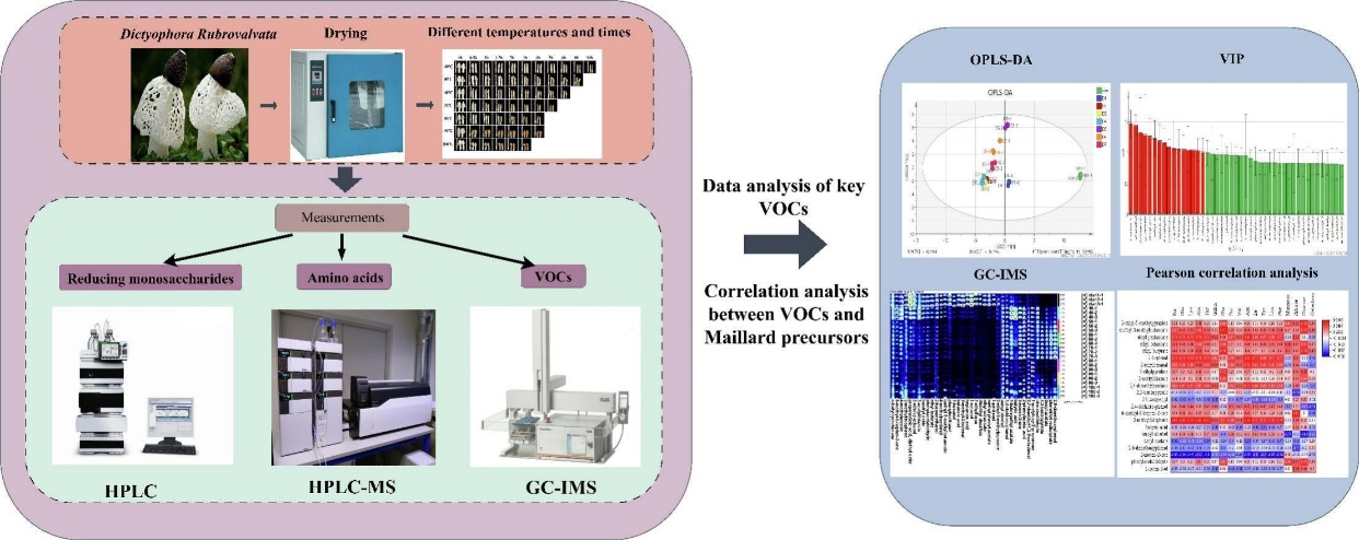 近日,学校食品科学与工程学院副教授许粟和孟令帅团队在国际知名期刊《Food Chemistry》(IF:8.5,中科院1区top期刊)发表题为“Effect of hot-air drying processing on the volatile organic compounds and maillard precursors ofDictyophora Rubrovalvatabased on GC-IMS,HPLC and LC-MS”的原创性研究论文。YABO鸭脖孟令帅为第一作者,2023级生物与医药专业硕士研究生聂玉为第二作者,许粟为通讯作者,YABO鸭脖官网为第一单位。