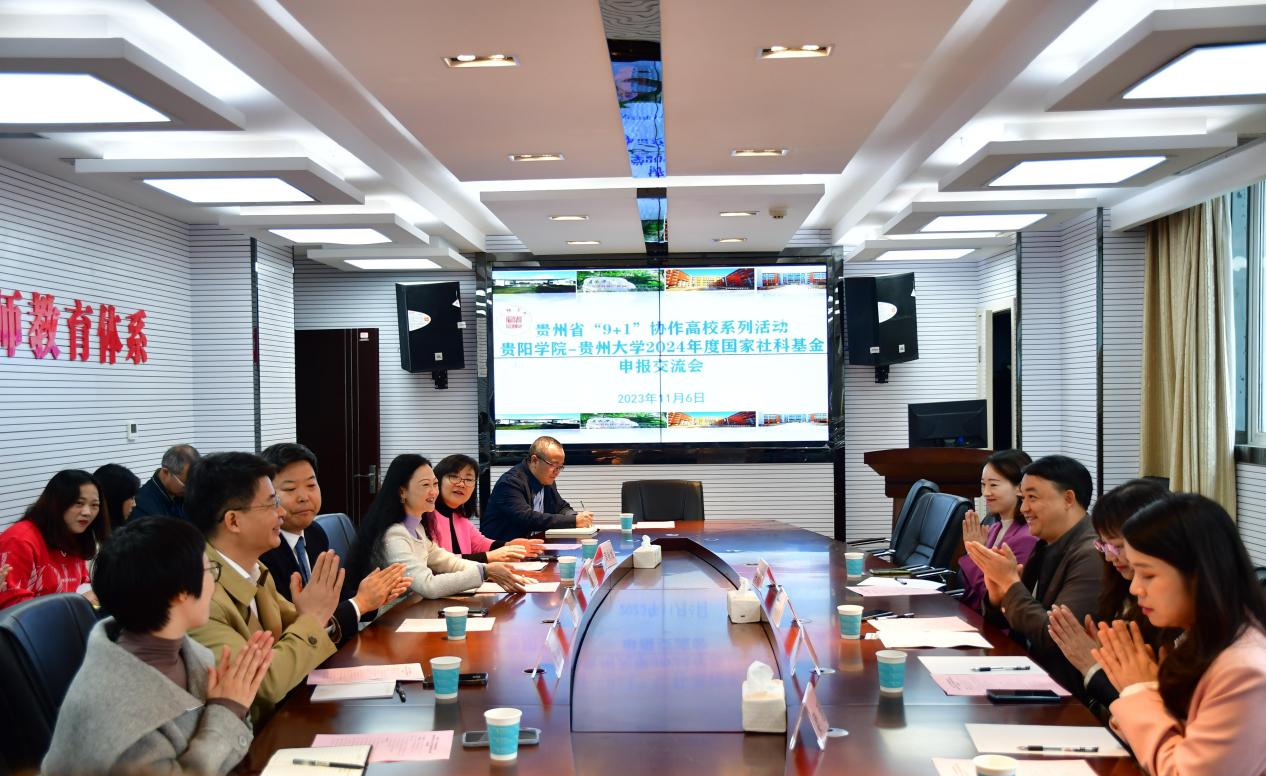 2023年11月6日上午,贵州省“9+1”协作高校系列活动:YABO鸭脖官网-贵州大学2024年度国家社科基金申报交流会在九思楼四楼会议室举行。贵州大学人文社科处副处长周乐欣、项目科科长肖贵秀、成果科科长梁瑶以及项目科副科长李倩倩赴YABO鸭脖开展工作交流。YABO鸭脖官网党委委员、副校长张加万出席会议,科研处副处长文娟,经管学院党委书记张韬,经管学院党委副书记黄咏梅以及科研处、经管学院相关博士、教授、工作人员参会。会议由文娟主持。
