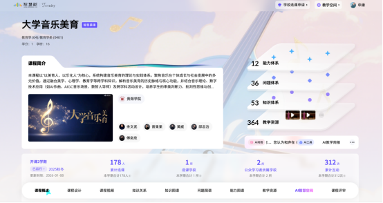 课程在智慧树平台上线,是学校积极响应国家教育数字化战略部署的具体行动。课程充分运用智慧树平台的智能化教学功能,通过知识图谱构建、AI智能推荐、个性化学习路径等智慧化手段,实现教学资源的精准推送和学习过程的动态优化。学生可通过平台实时查看学习进度、参与在线互动、完成智能测评,教师则能通过学情数据分析,精准把握教学重点难点,实现因材施教。这种智慧化教学模式,既是对教育部《关于加快推进教育数字化的意见》中“推动人工智能与教育教学深度融合”要求的落实,也是学校探索“人工智能+教育”创新应用场景的实践探索,旨在通过数字化手段提升教学效率和质量,让优质美育资源惠及更多学生。