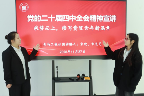 学校依托学生党员、团干部、优秀学子等骨干力量,以朋辈视角开展特色宣讲,用青年语言解读全会精神,推动党的二十届四中全会精神在青年群体中落地生根,引导学子将个人成长与国家发展同频共振,11月27日,“青马工程”学生社团在校史馆以“党的二十届四中全会精神宣讲——乘势而上,续写贵院青年新篇章”为主题,从全会核心意义、发展成就、未来蓝图与实践路径四个维度展开宣讲。现场的学生在理论滋养与实践分享中凝聚青春共识、激发奋进力量。