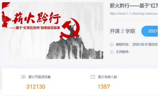 学校通过薪火黔行项目,录制教师慕课12套、教学设计方案12套、录制学生微课13节,长征故事10套,充分运用学习通平台的教学辅助功能,通过课堂教学、线上问答、课后学习、作业交流的方式,形成全新的课程混合式学习模式。截至目前,课程平台访问量达30余万次。